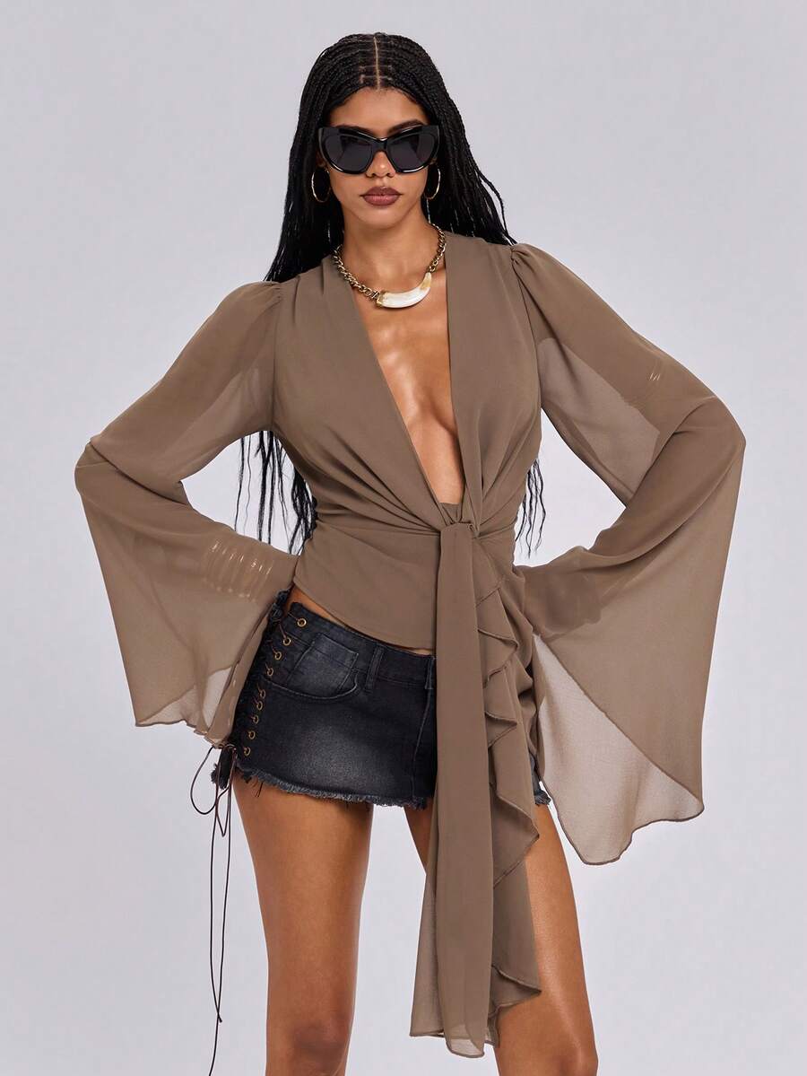 Y2K Spring/Summer Avant-Garde Sexy Deep V Backless Flare Sleeve Sheer Blouse For Women