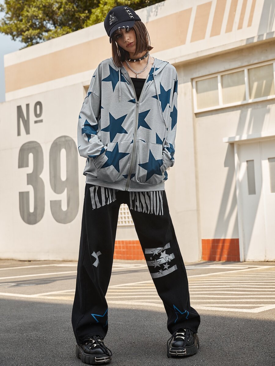 Star Print Drop Shoulder Zip Up Drawstring Hoodie