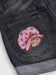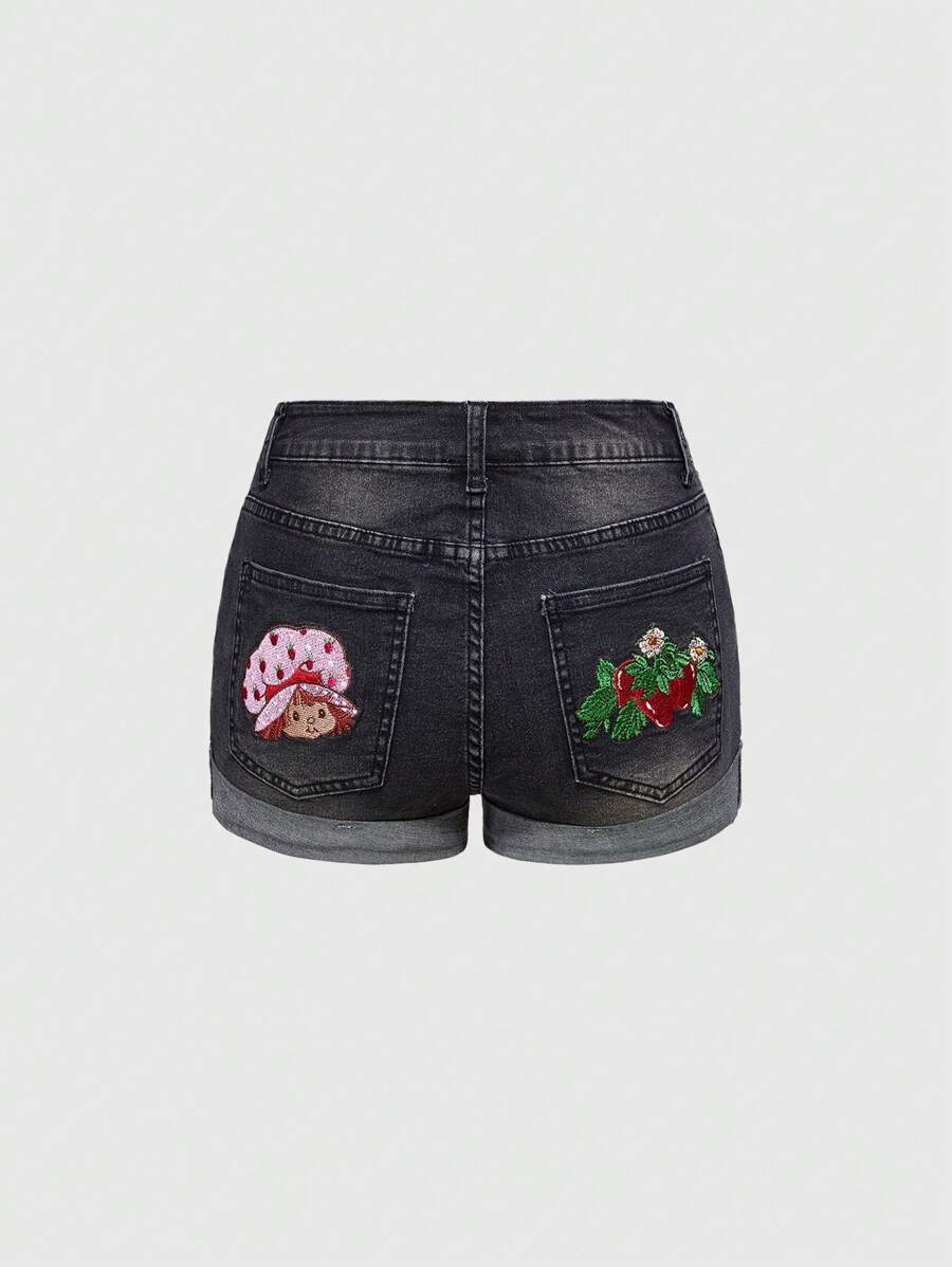Strawberry & Cartoon Embroidered Fashion Women Denim Shorts