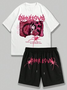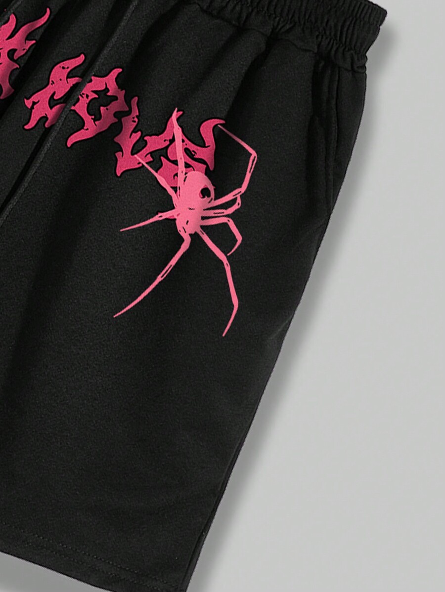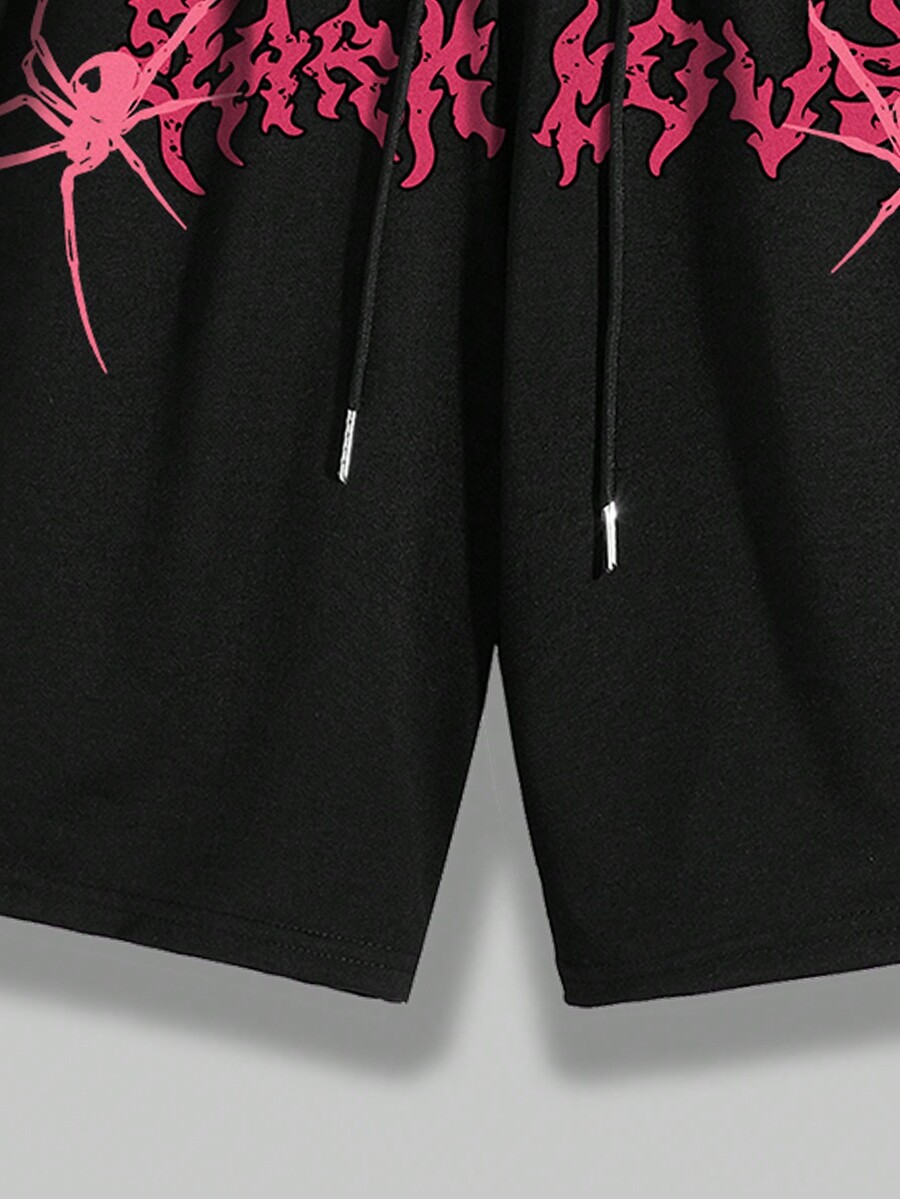 Street Life 2pcs Men'S Streetwear Style Spider Print T-Shirt And Shorts Set With Slogan, Suitable For Daily Wear In Spring And Summer