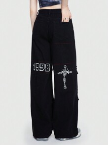 Street Life Casual Street Style Cross Embroidery 1998 Ripped Distressed Washed Denim Jeans