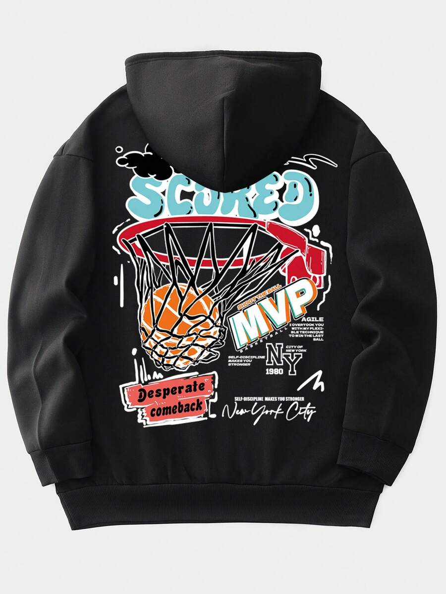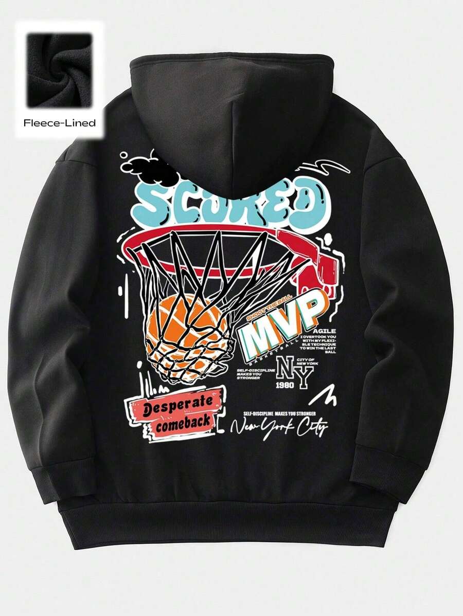 Street Life Men Basketball & Letter Graphic Drawstring Thermal Lined Hoodie