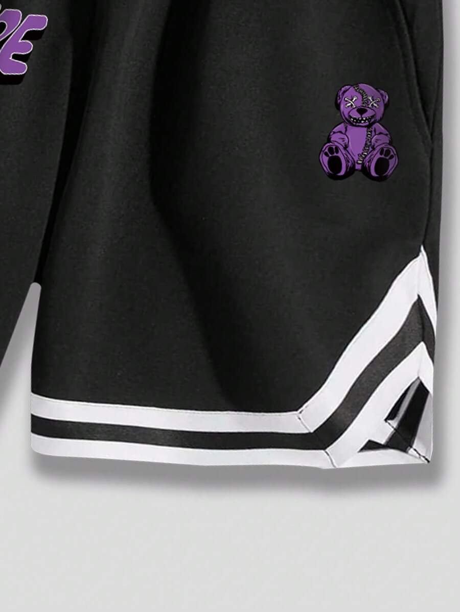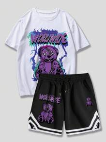 Street Life Men Bear Letter Graphic Basketball Jersey Style Tee & Striped Trim Drawstring Waist Shorts, School