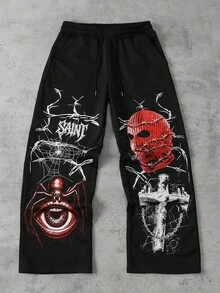 Street Life Men Eye & Cross Print Sweatpants, Retro Street Style, Fall