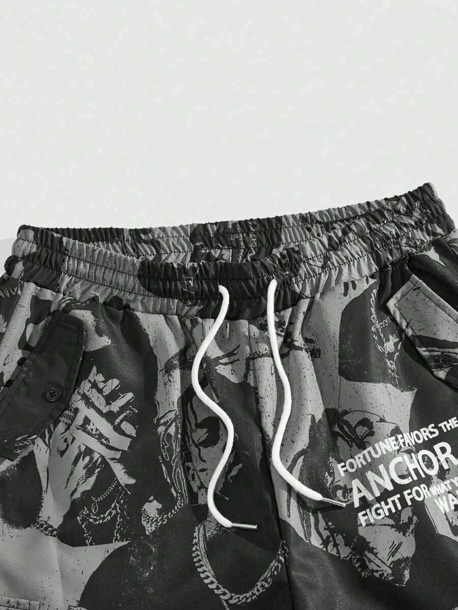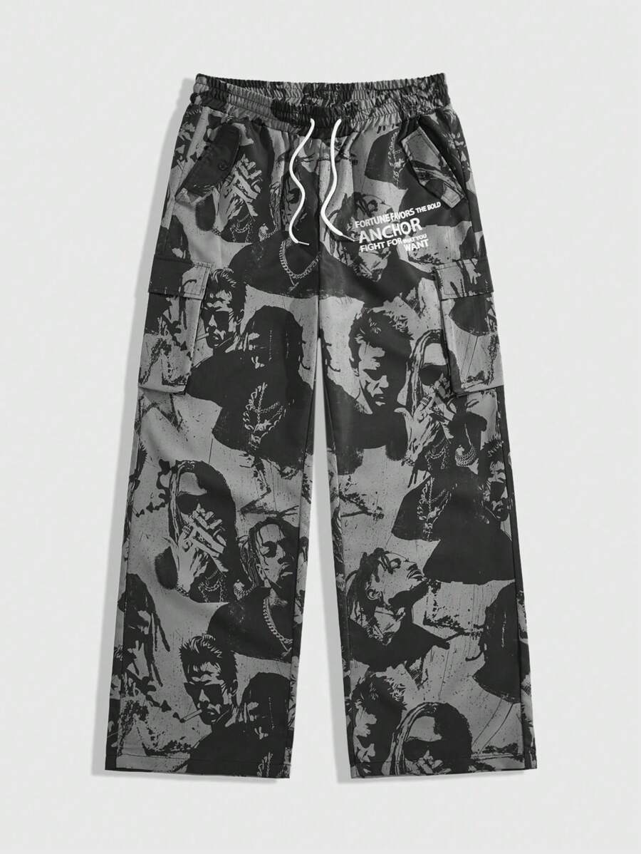 Street Life Men Fashion Versatile Drawstring Waist Full Print Woven Long Pants, Fall