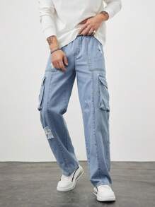 Street Life Men Ripped Flap Pocket Side Cargo Jeans