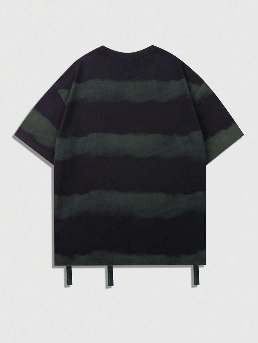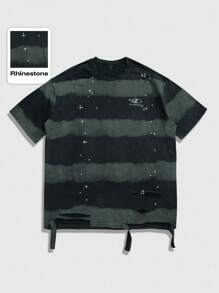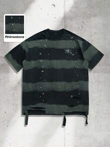 Street Life Men Striped Print Contrast Color Round Neck Short Sleeve T-Shirt With Rhinestone Distressed Design, 2000s Style