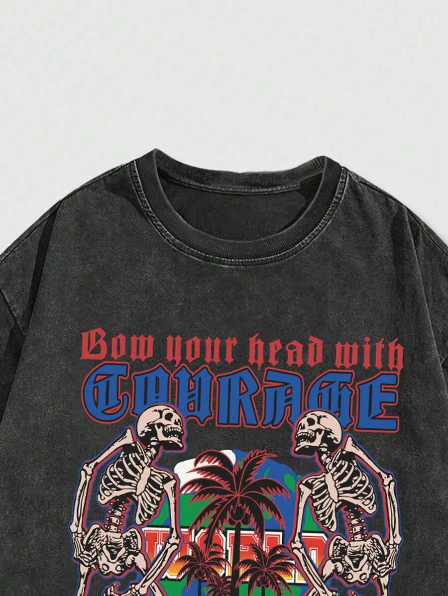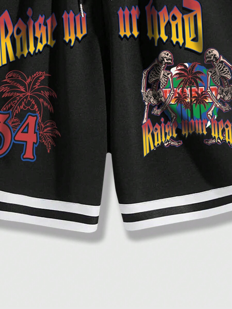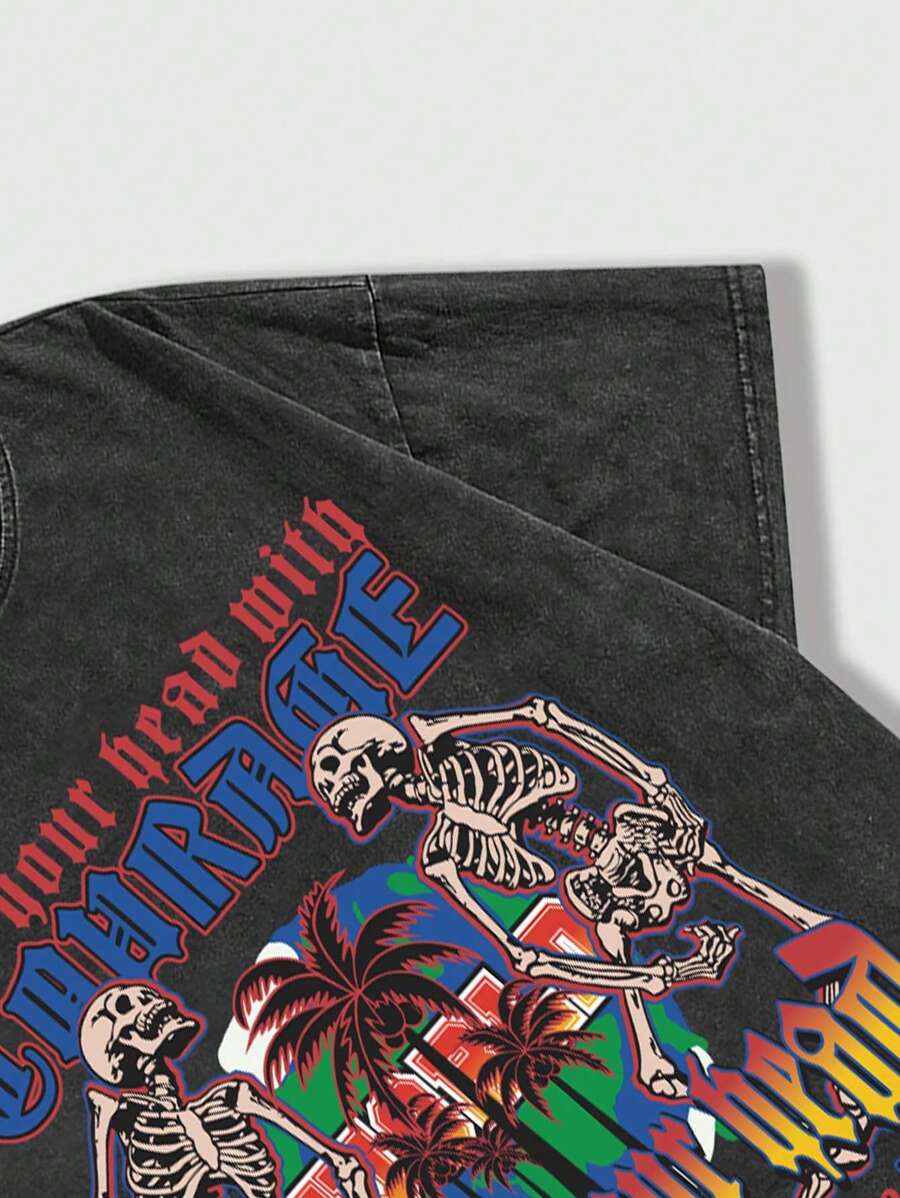 Street Life Men's 2pcs Snow Washed Skull Pattern Printed Short Sleeve T-Shirts And Shorts, Suitable For Daily Wear In Spring And Summer
