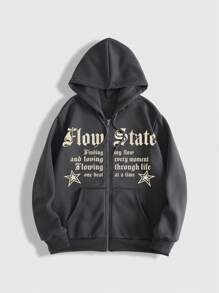 Street Life Men's Autumn Slogan & Star Graphic Drawstring Zipper Front Hoodie Sweatshirt