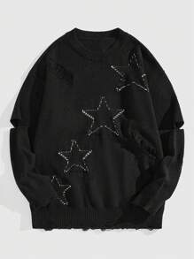 Street Life Men's Casual Crew Neck Distressed Pentagram Graphic Loose Knit Sweater, Spring Autumn