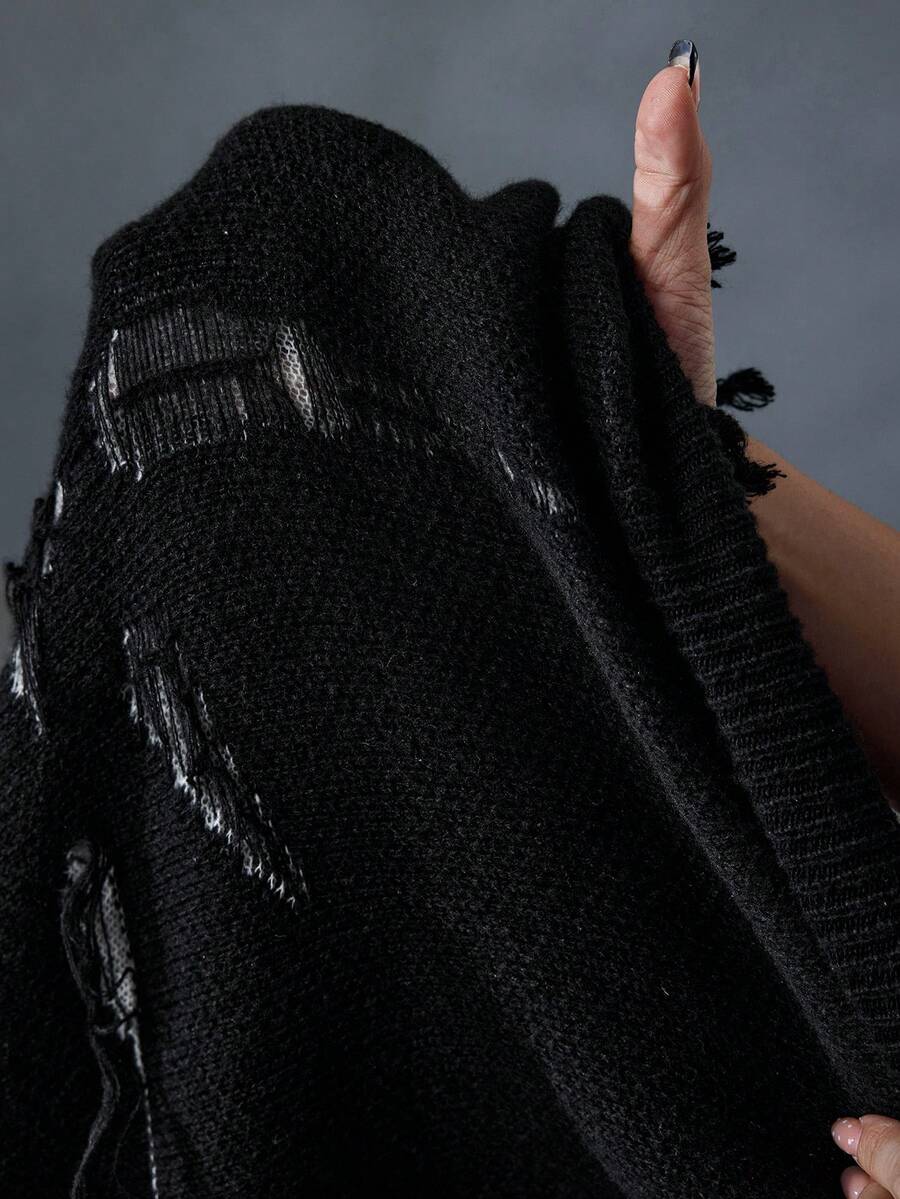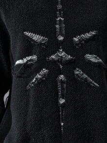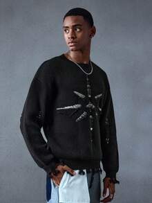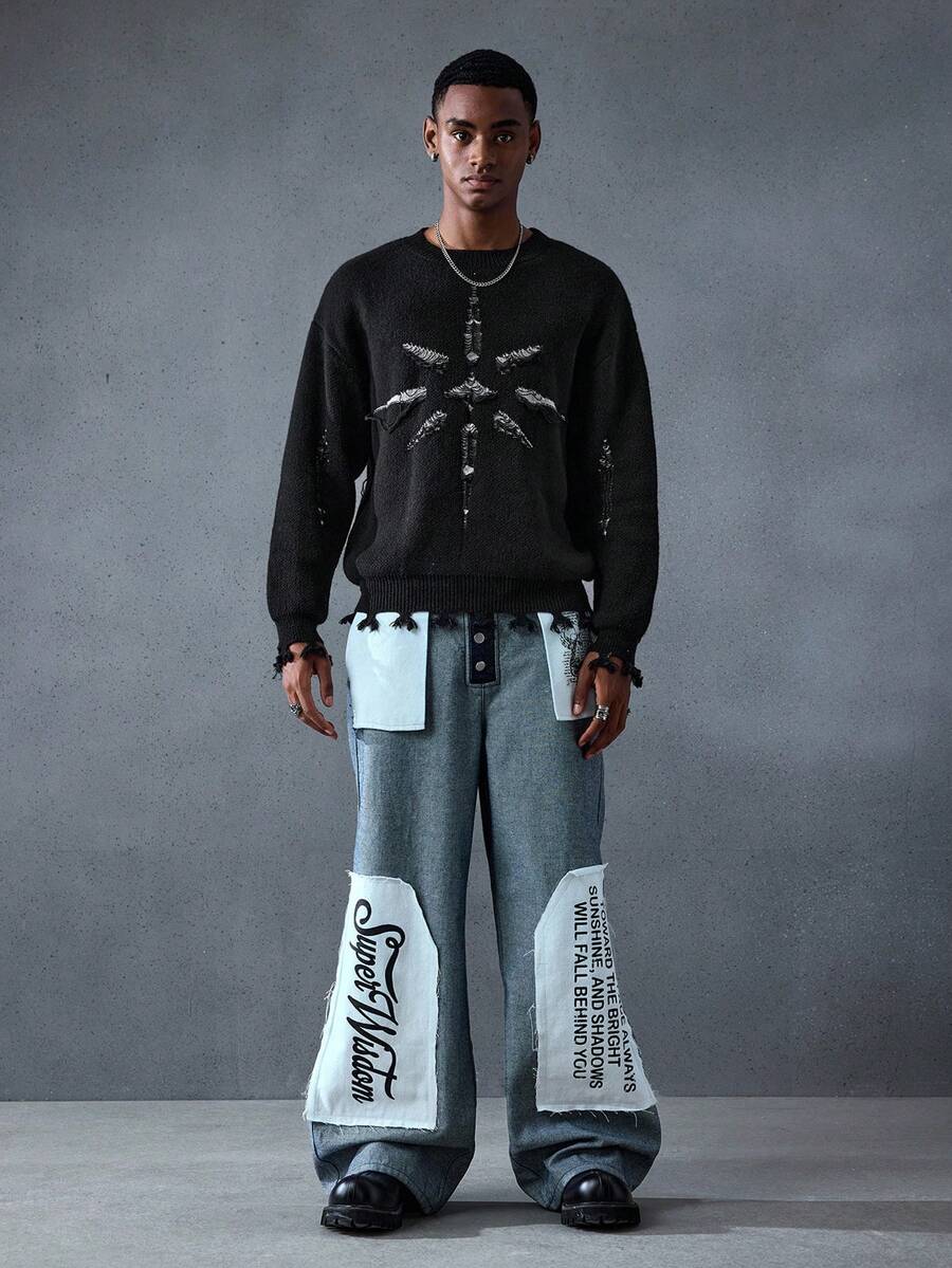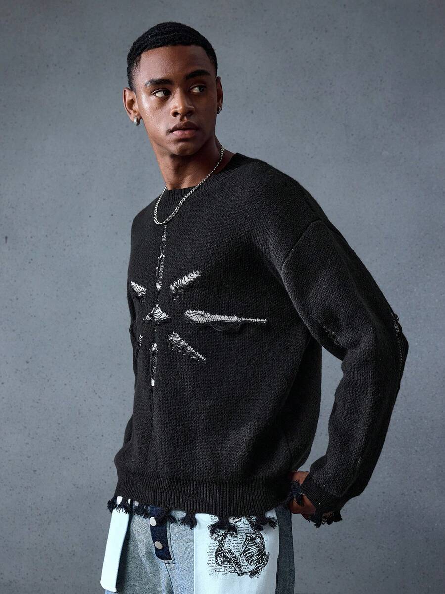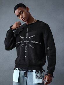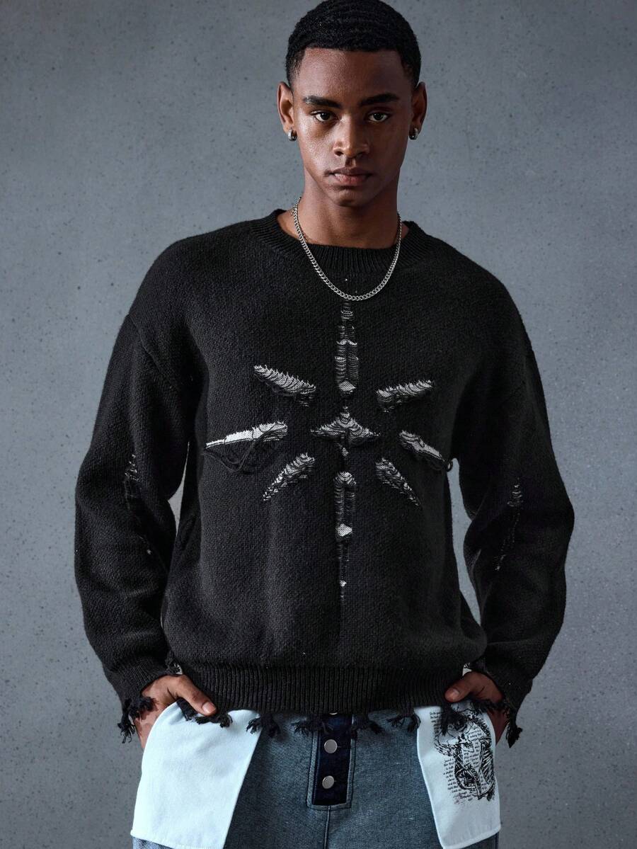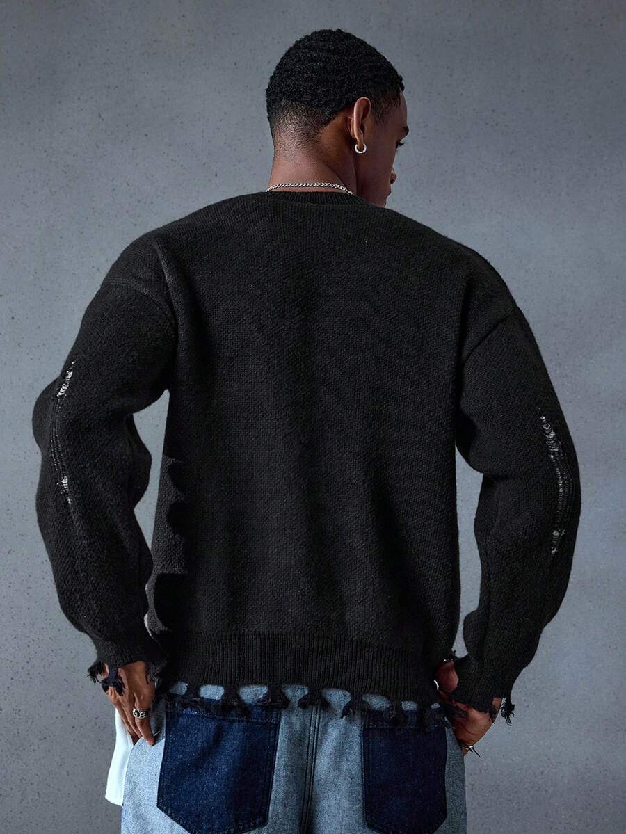 Street Life Men's Casual Distressed Crew Neck Drop Shoulder Long Sleeve Sweater, Autumn/Winter, Grunge Style