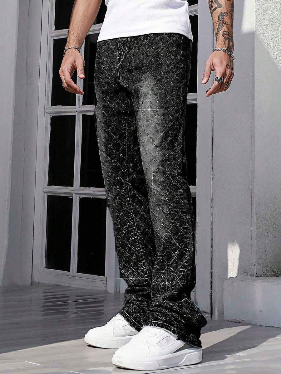 Street Life Men's Casual Distressed Wash Rhinestone Decor Denim Jeans