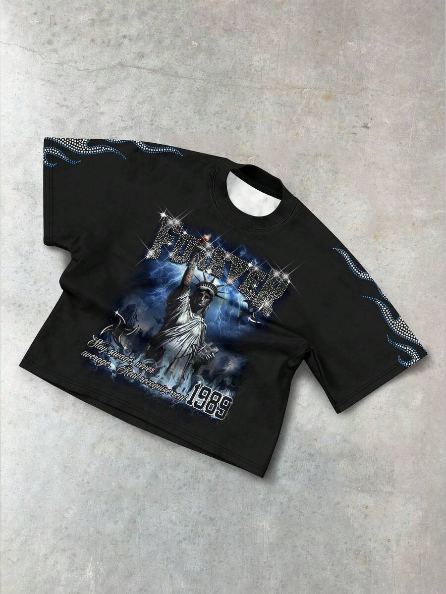 Street Life Men's Casual Fashion Street Statue Of Liberty Slogan Print Rhinestone Embellished Short Sleeve T-Shirt, Summer