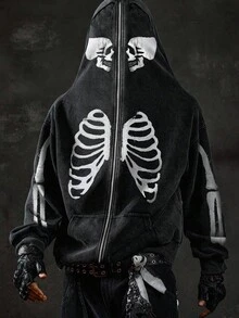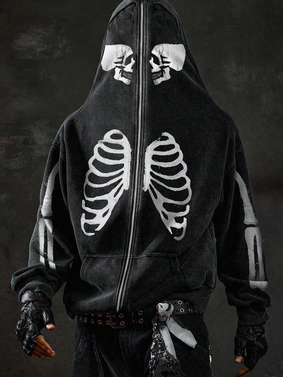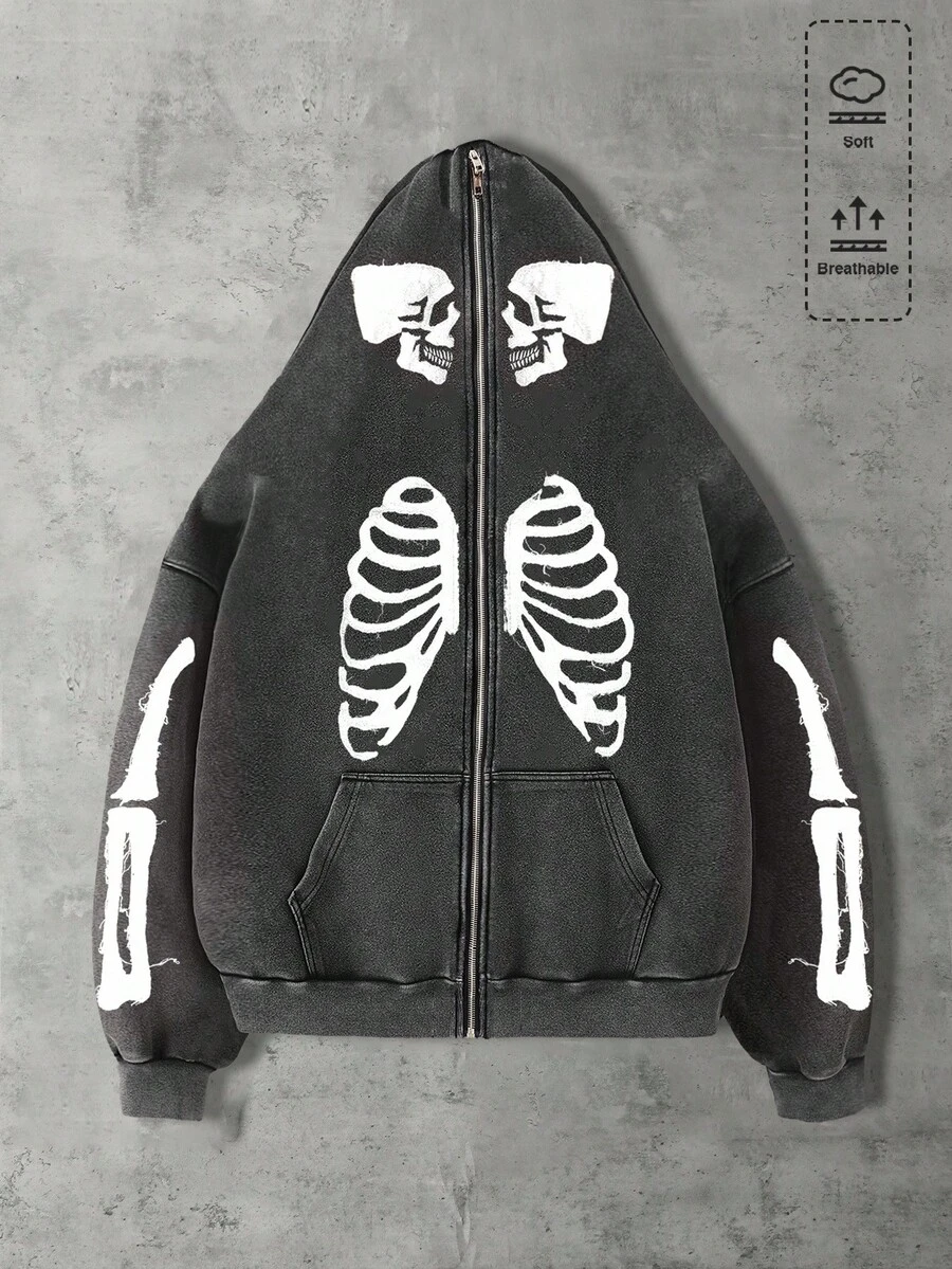 Street Life Men's Casual Fashionable Street Skeleton Print Loose Fit Zip-Up Hoodie Sweatshirt, Suitable For Spring/Autumn
