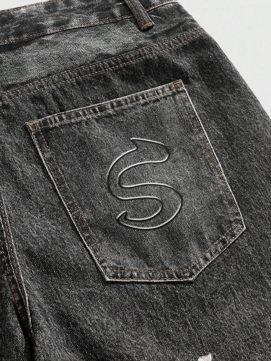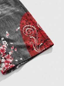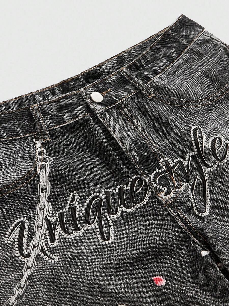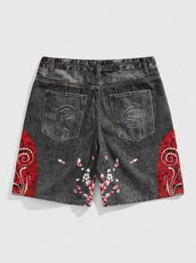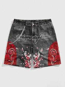 Anime Men's Casual Floral & Letter Chain Printed Loose Denim Shorts, Summer