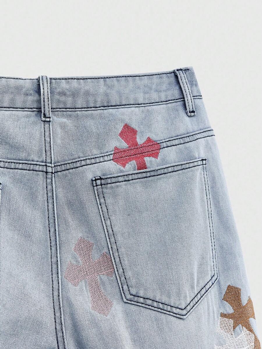 Street Life Men's Casual Washed Cross Embroidery Denim Jeans