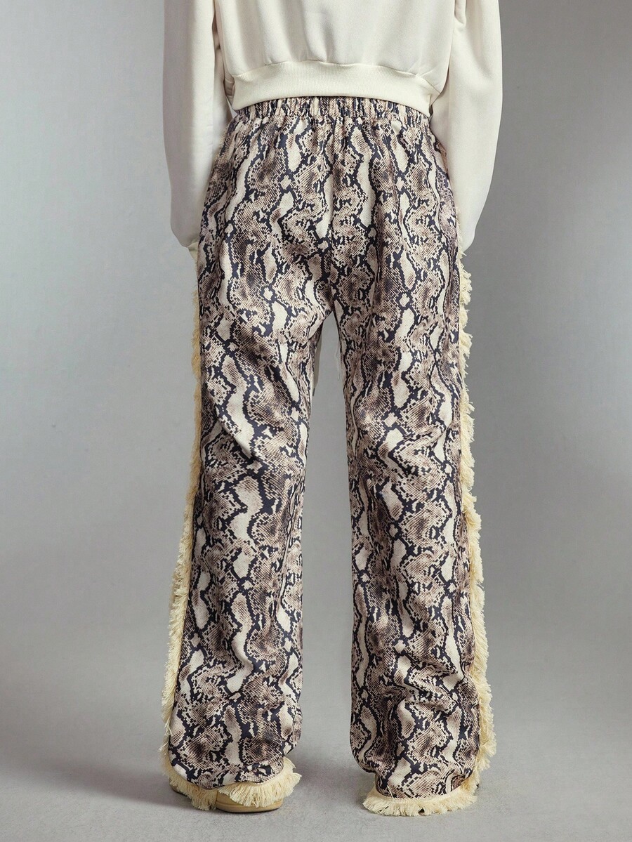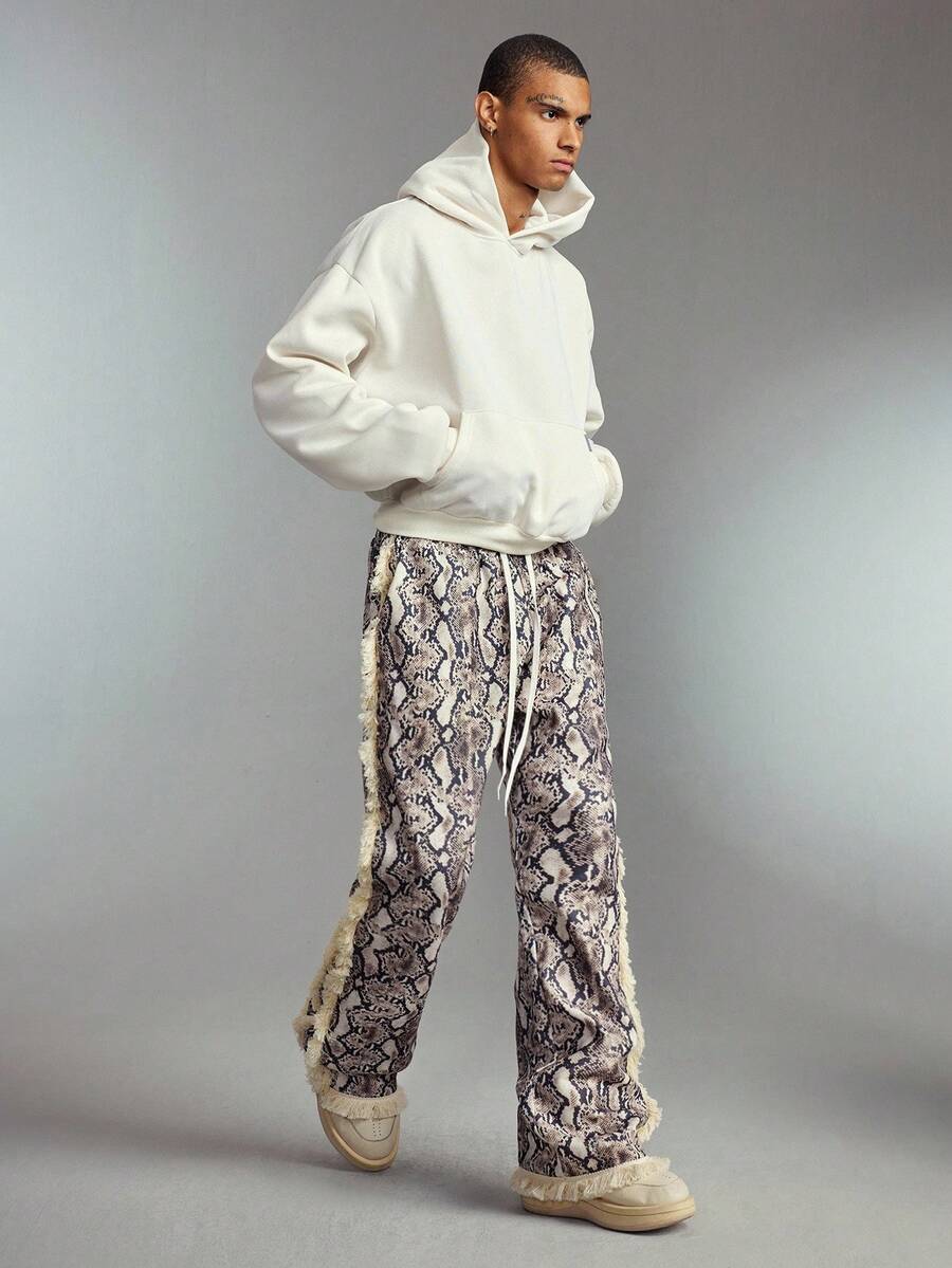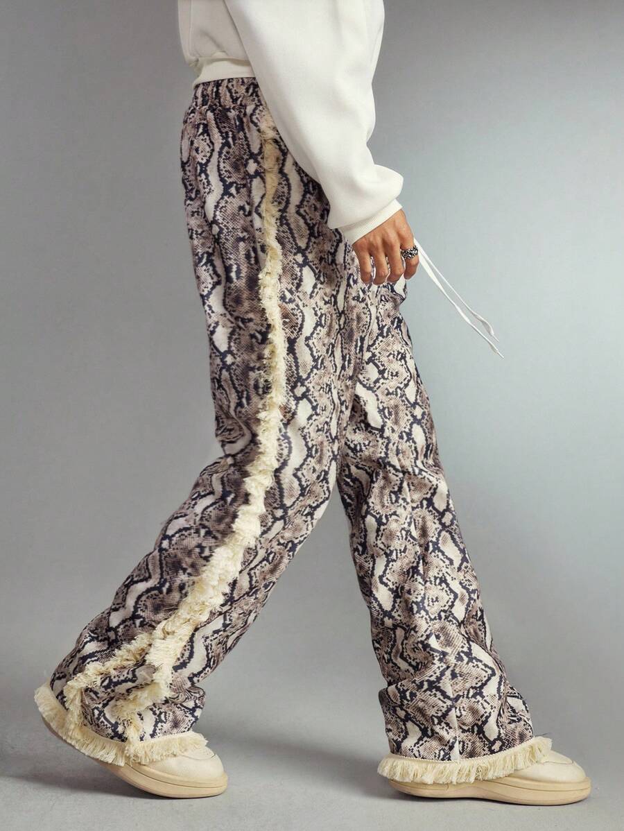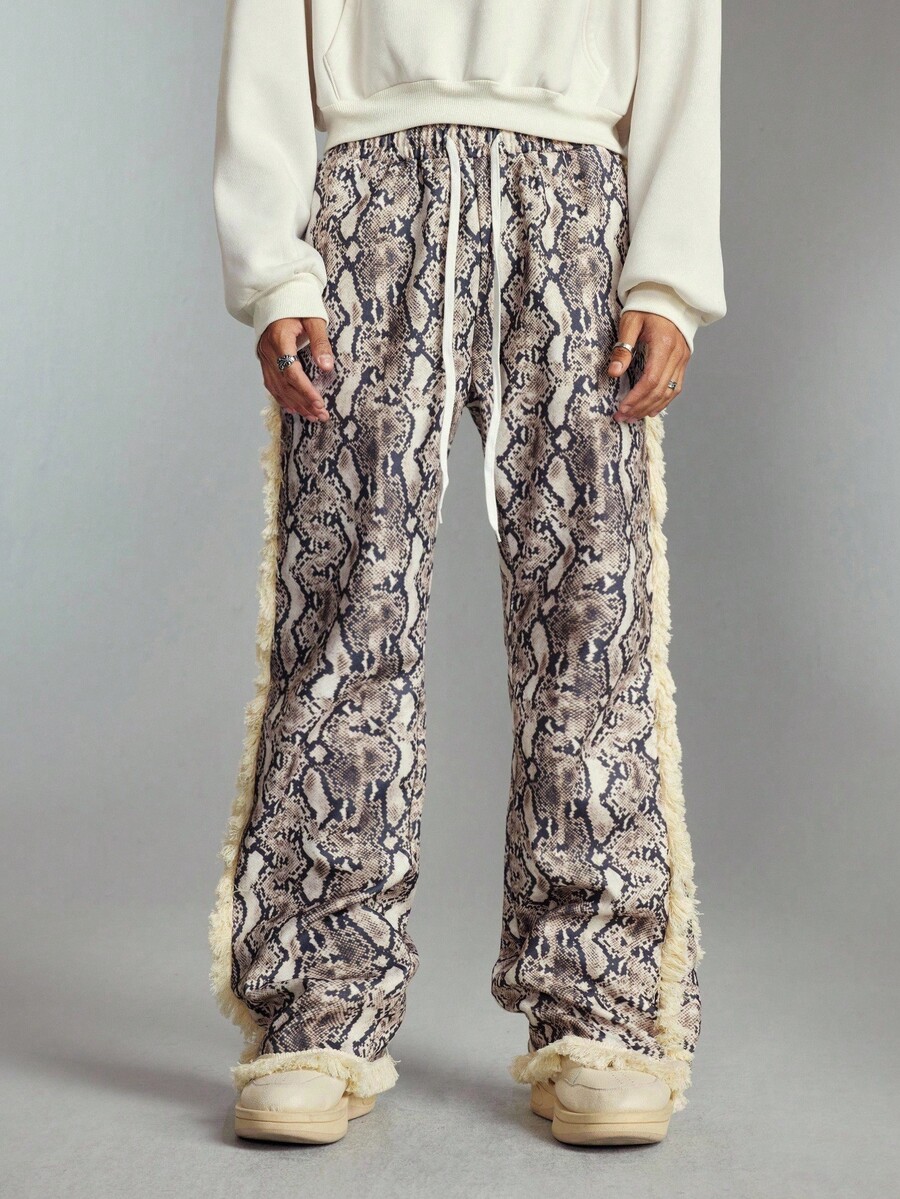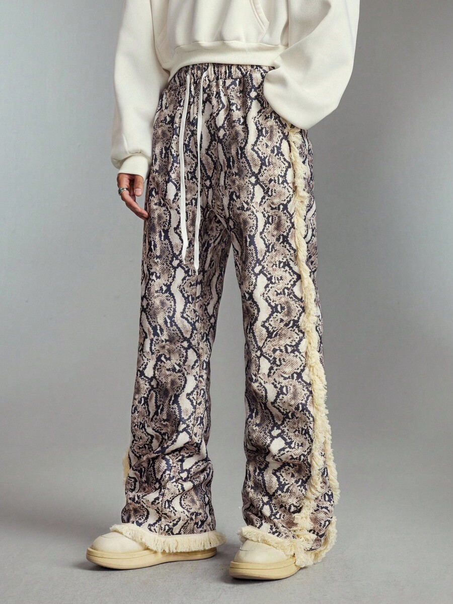 Street Life Men's Drawstring Waist Wide Leg Loose Frayed Snake Skin Layered Long Pants, For Fall
