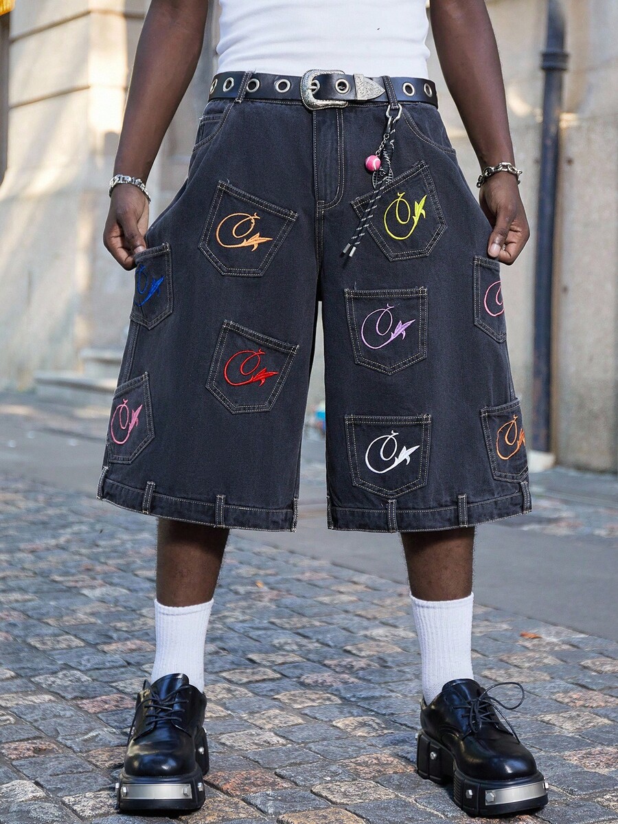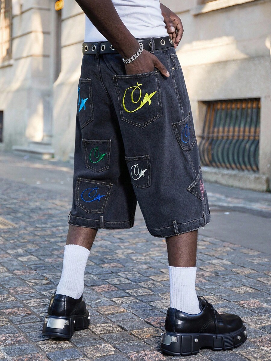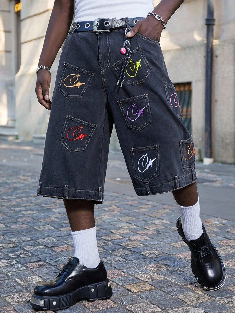 Street Life Men's Embroidered Pattern Multi-Pocket Denim Shorts