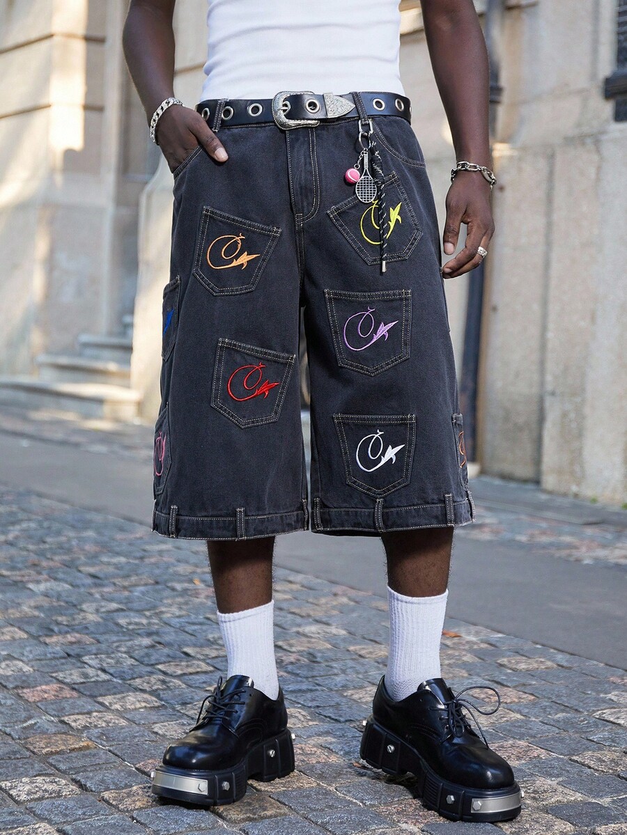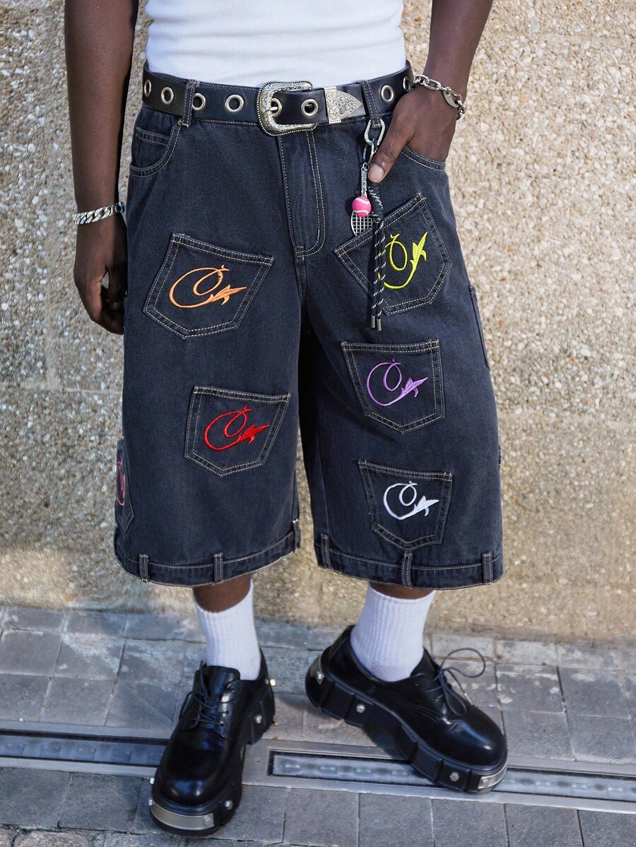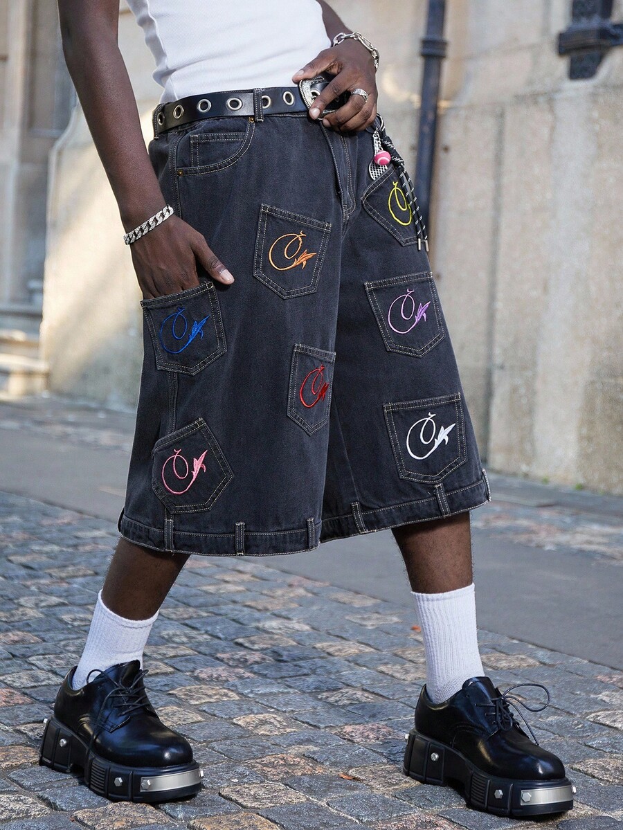 Street Life Men's Embroidered Pattern Multi-Pocket Denim Shorts