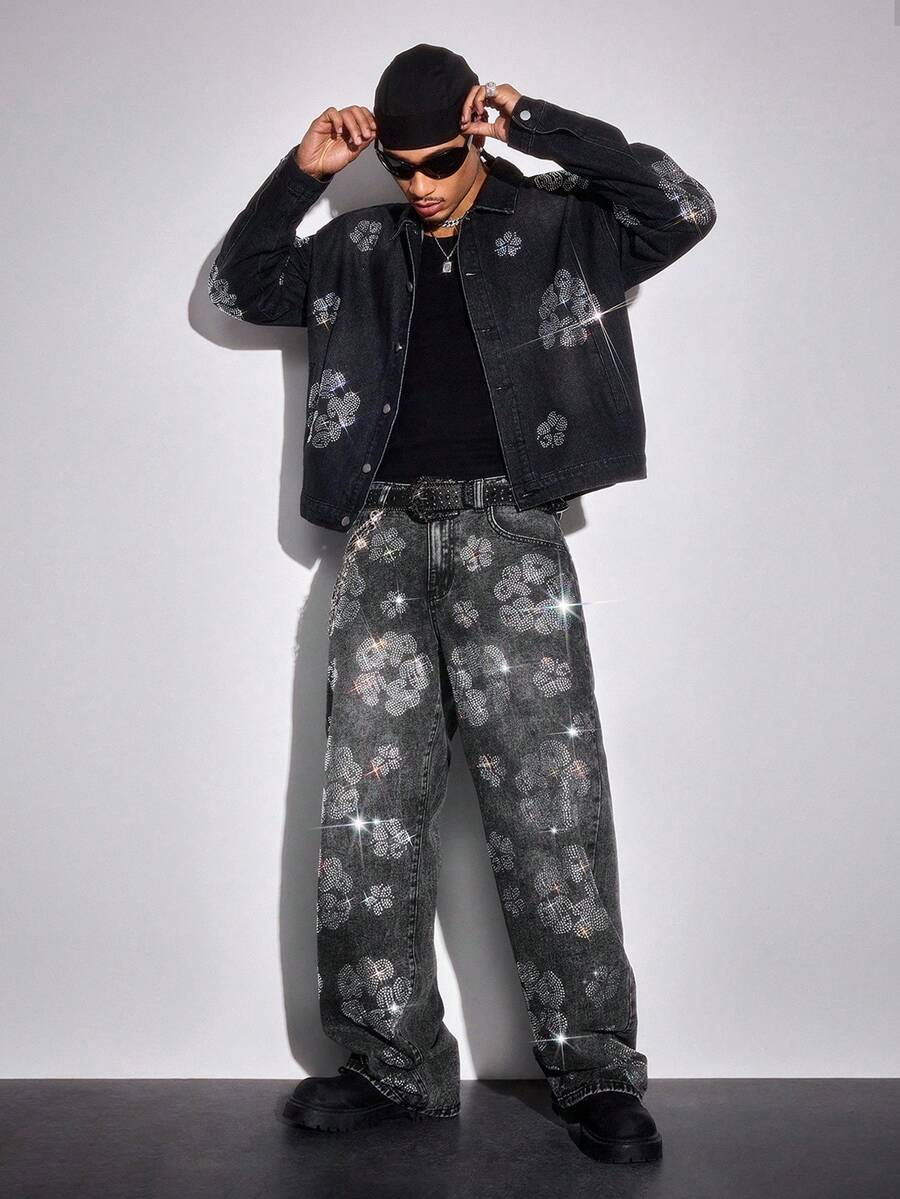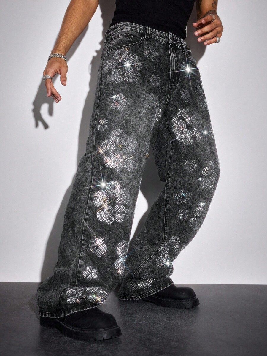 Street Life Men's Fashion Washed Distressed Rhinestone Embellished Jeans