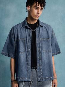 Street Life Men's Fashionable Rhinestone Denim Shirt, Suitable For Summer