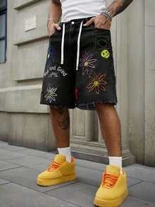 Street Life Men's Floral Embroidery Pocket Loose Bermuda Denim Shorts