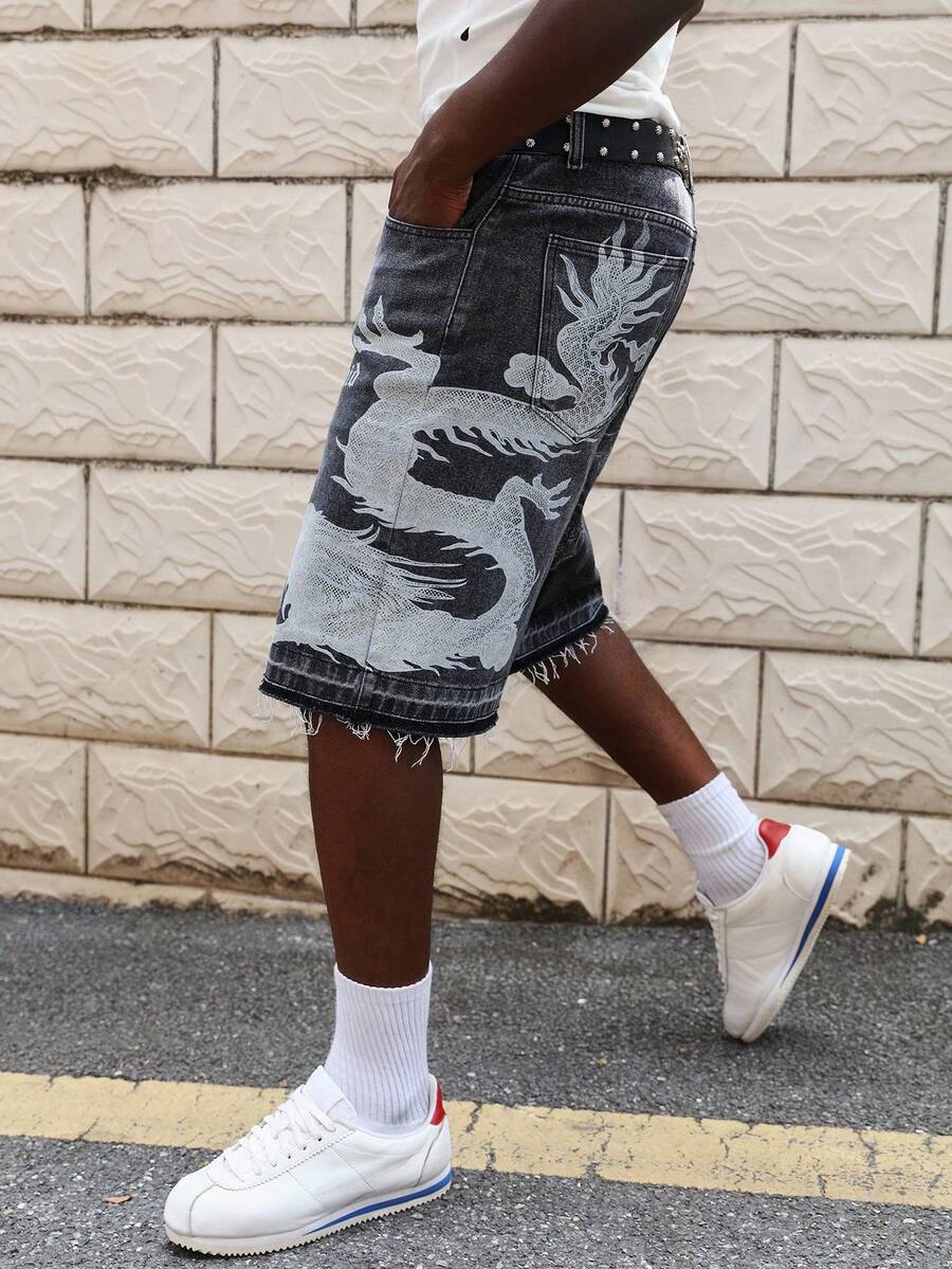 Street Life Men's Gothic Washed Cross Dragon Print Denim Shorts, Halloween