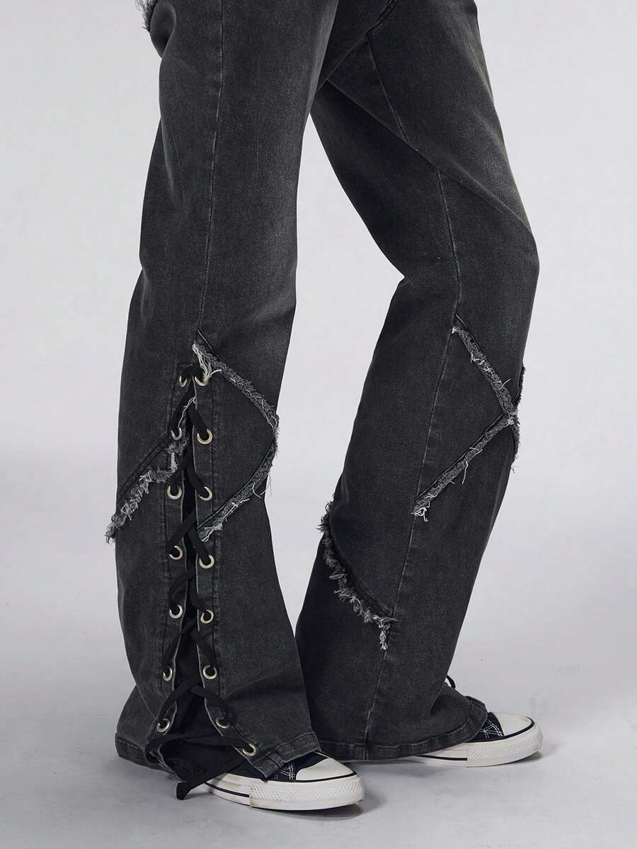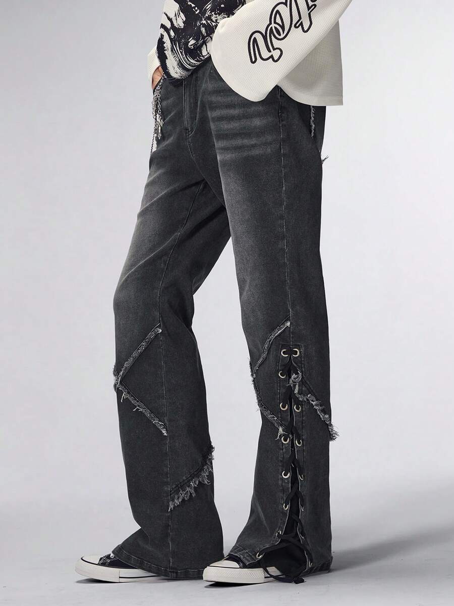 Street Life Men's High Waist Casual Fashion Versatile Tie-Up Black Straight Leg Jeans