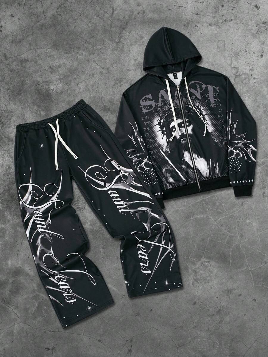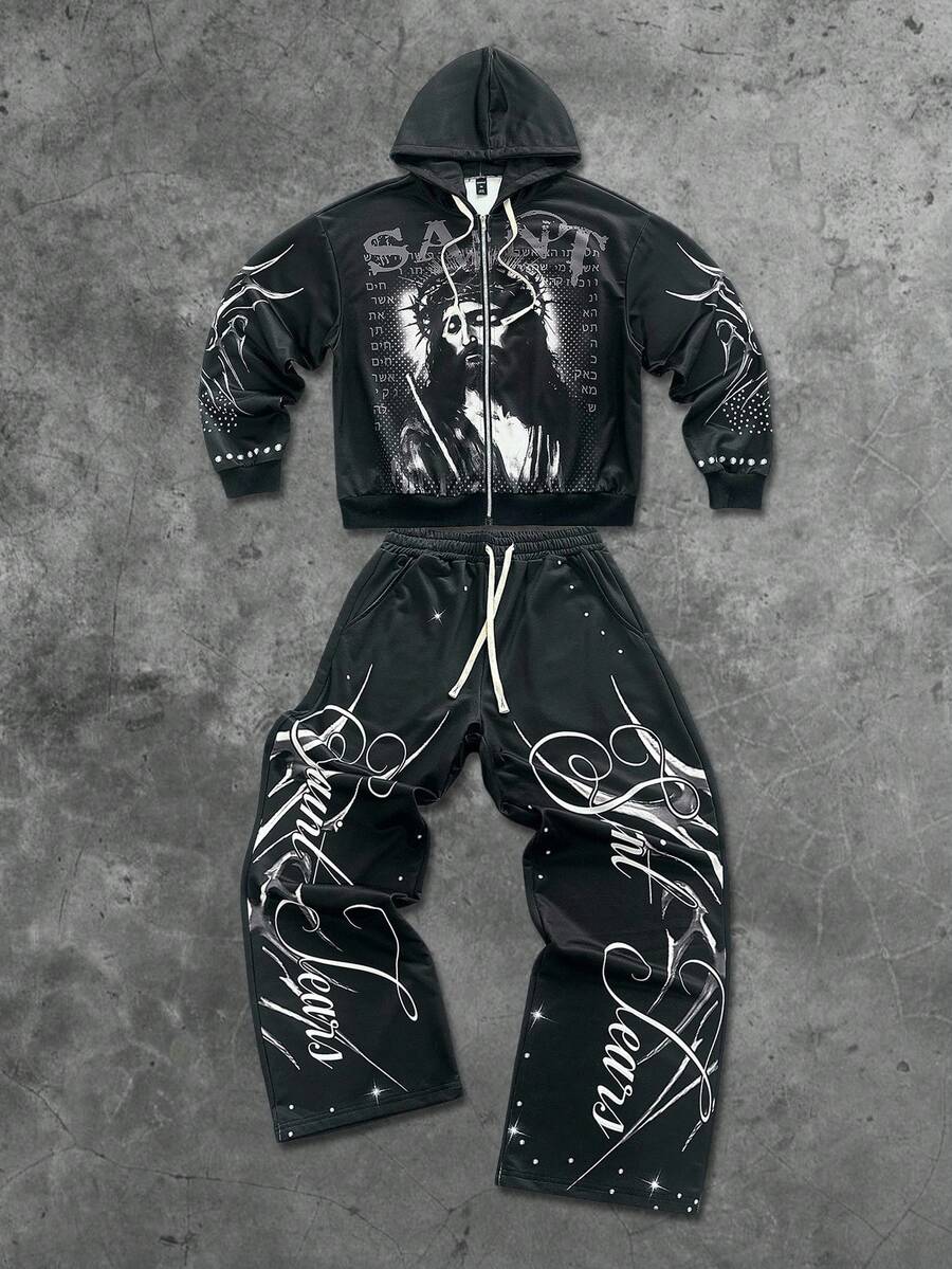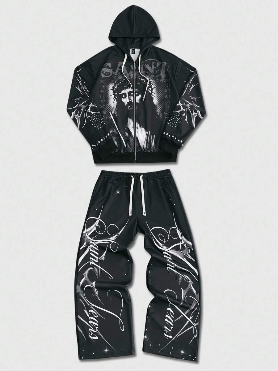 Street Life Men's Hooded Sweatshirt Set, Street American Jesus English Graphic Print Zip-Up Hoodie & Pants Set, Fall Clothes