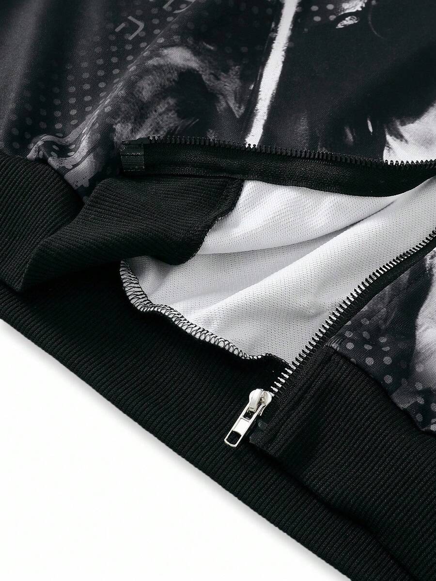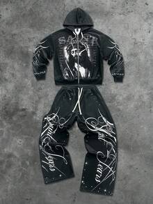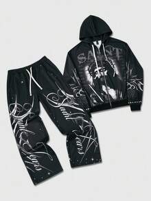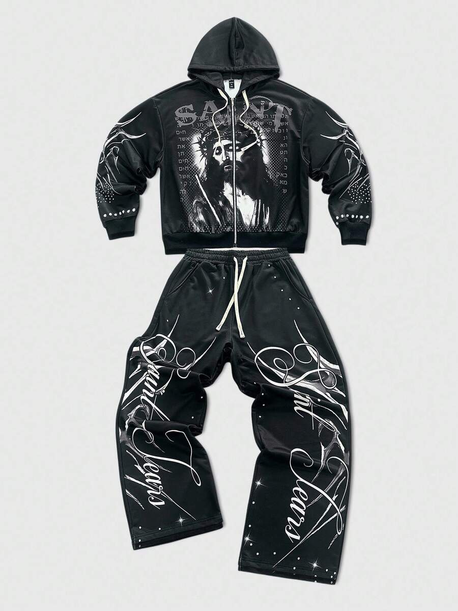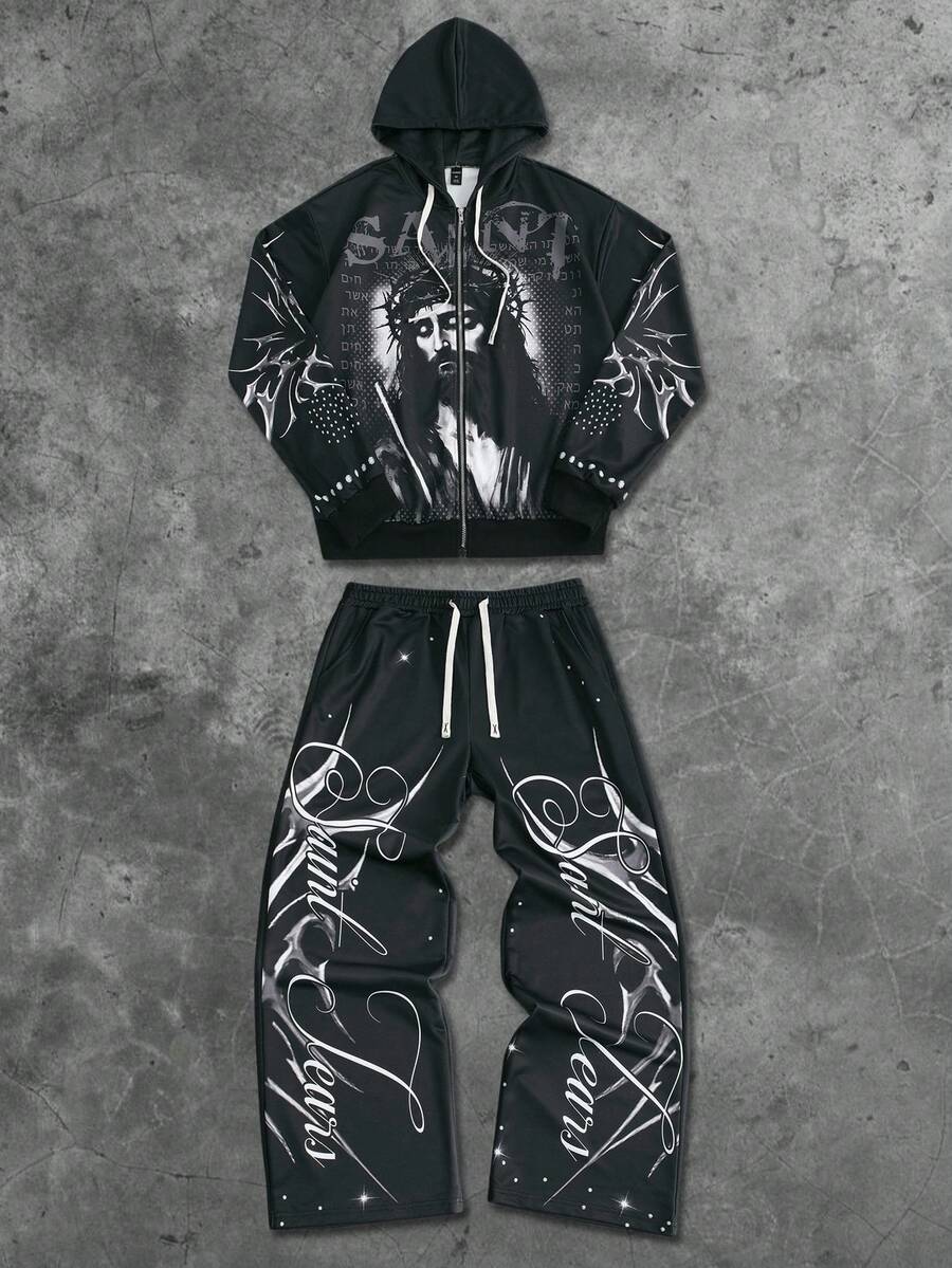 Street Life Men's Hooded Sweatshirt Set, Street American Jesus English Graphic Print Zip-Up Hoodie & Pants Set, Fall Clothes