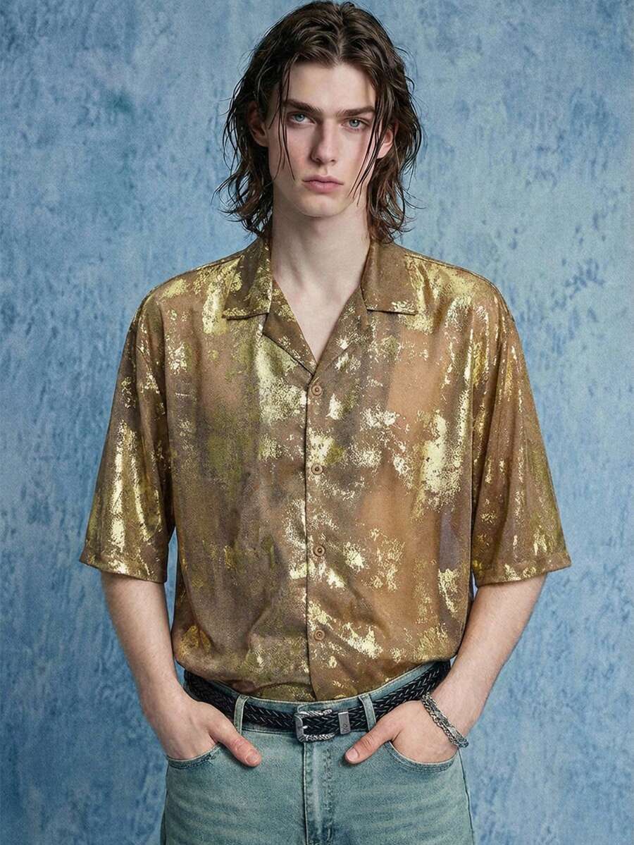 Street Life Men's Knitted Crinkle Foil Short Sleeve Single-Breasted Shirt