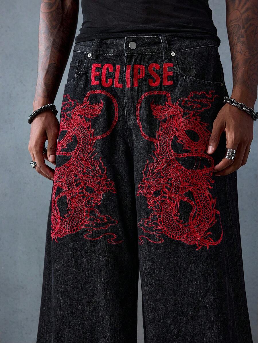 Street Life Men's Loose Fit Dragon Embroidery Baggy Jeans