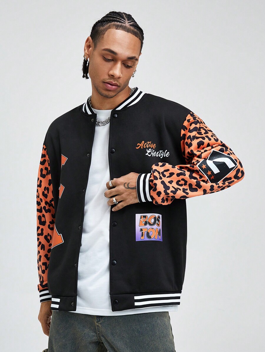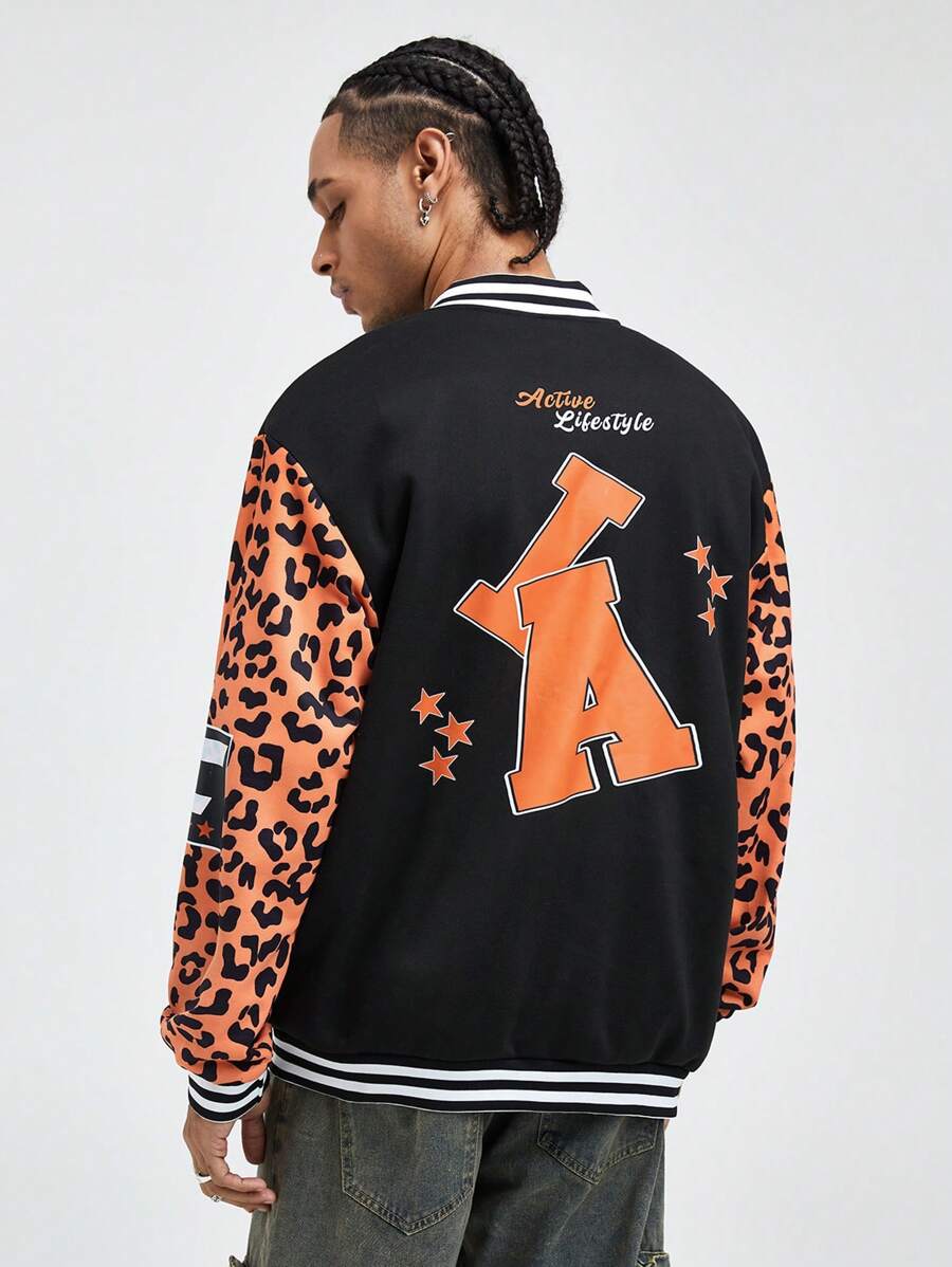 Street Life Men's Loose Fit Leopard Print Letter Casual Baseball Jacket For Autumn/Winter