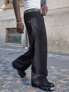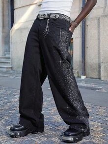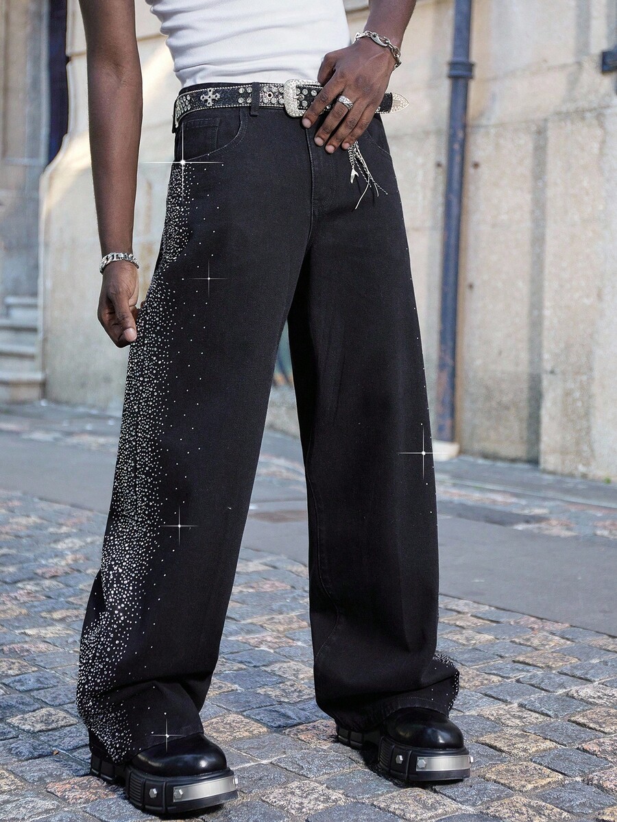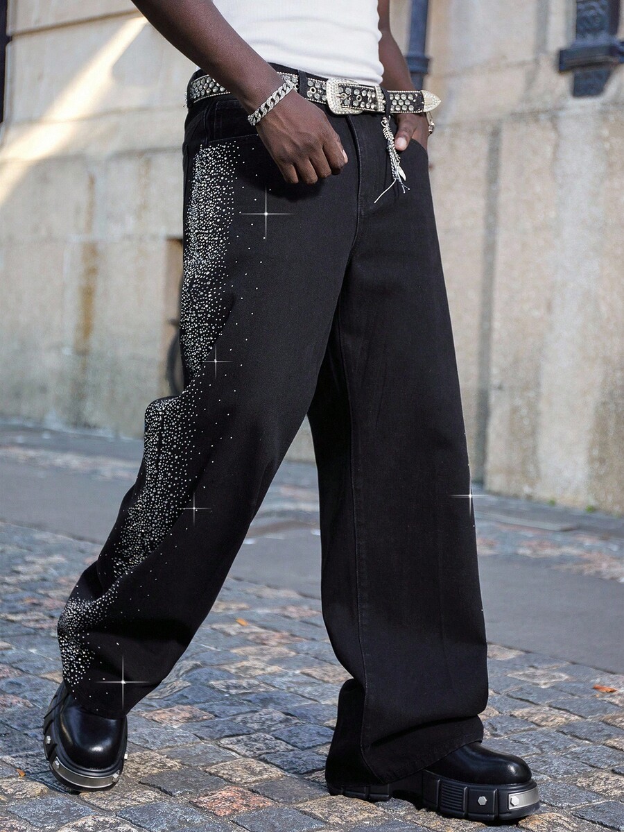 Street Life Men's Loose Fit Rhinestone Embellished Pocket Wide Leg Casual Jeans