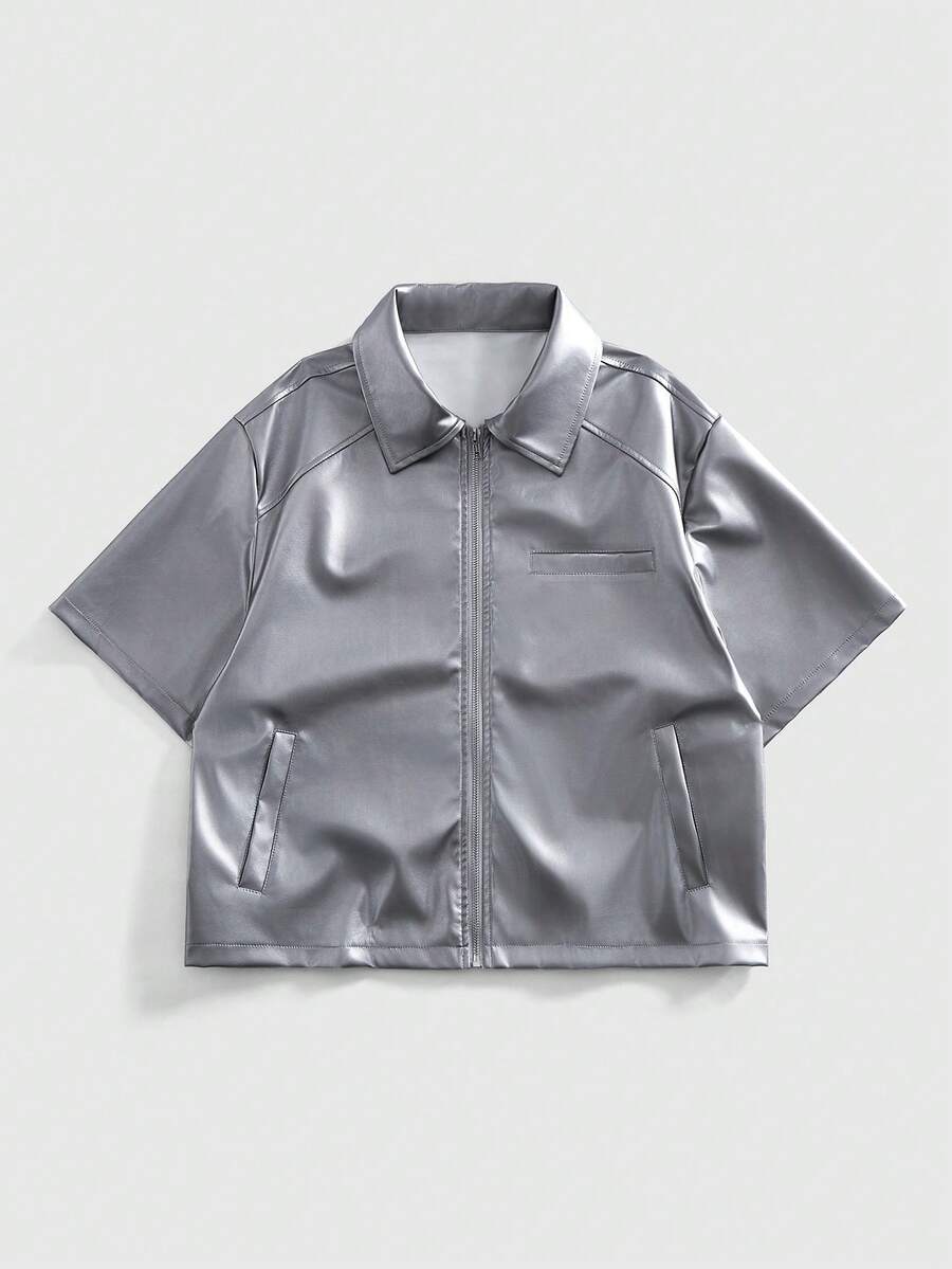 Street Life Men's PU Shiny Silver Zipper Pocket Casual Short Sleeve Shirt