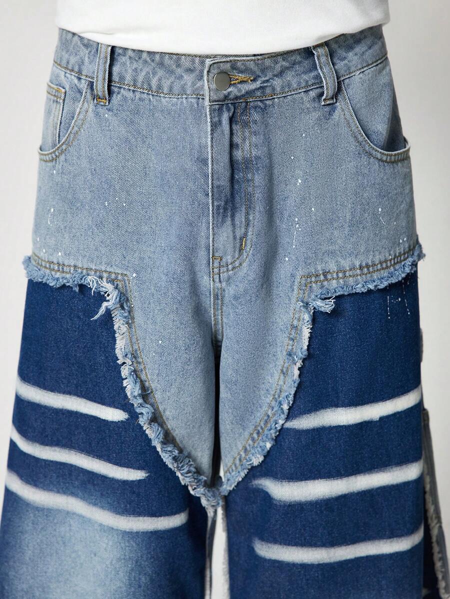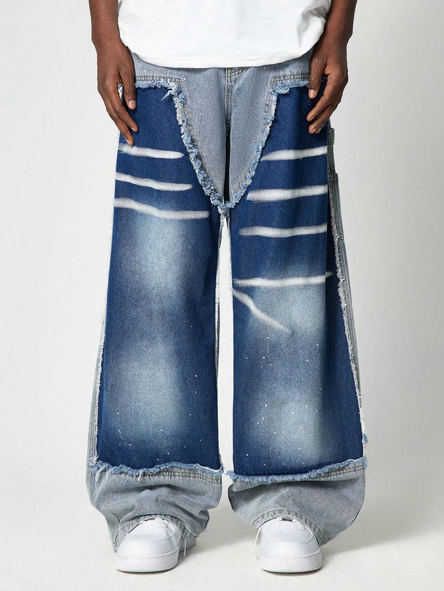 Street Life Men's Patchwork Frayed Edge Colorblock Insert Pocket Loose Wide Leg Casual Jeans