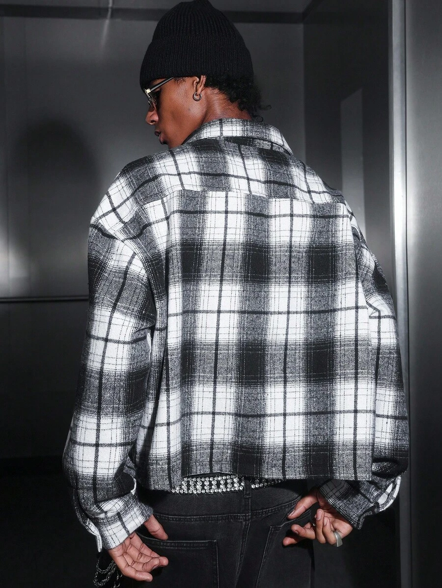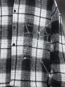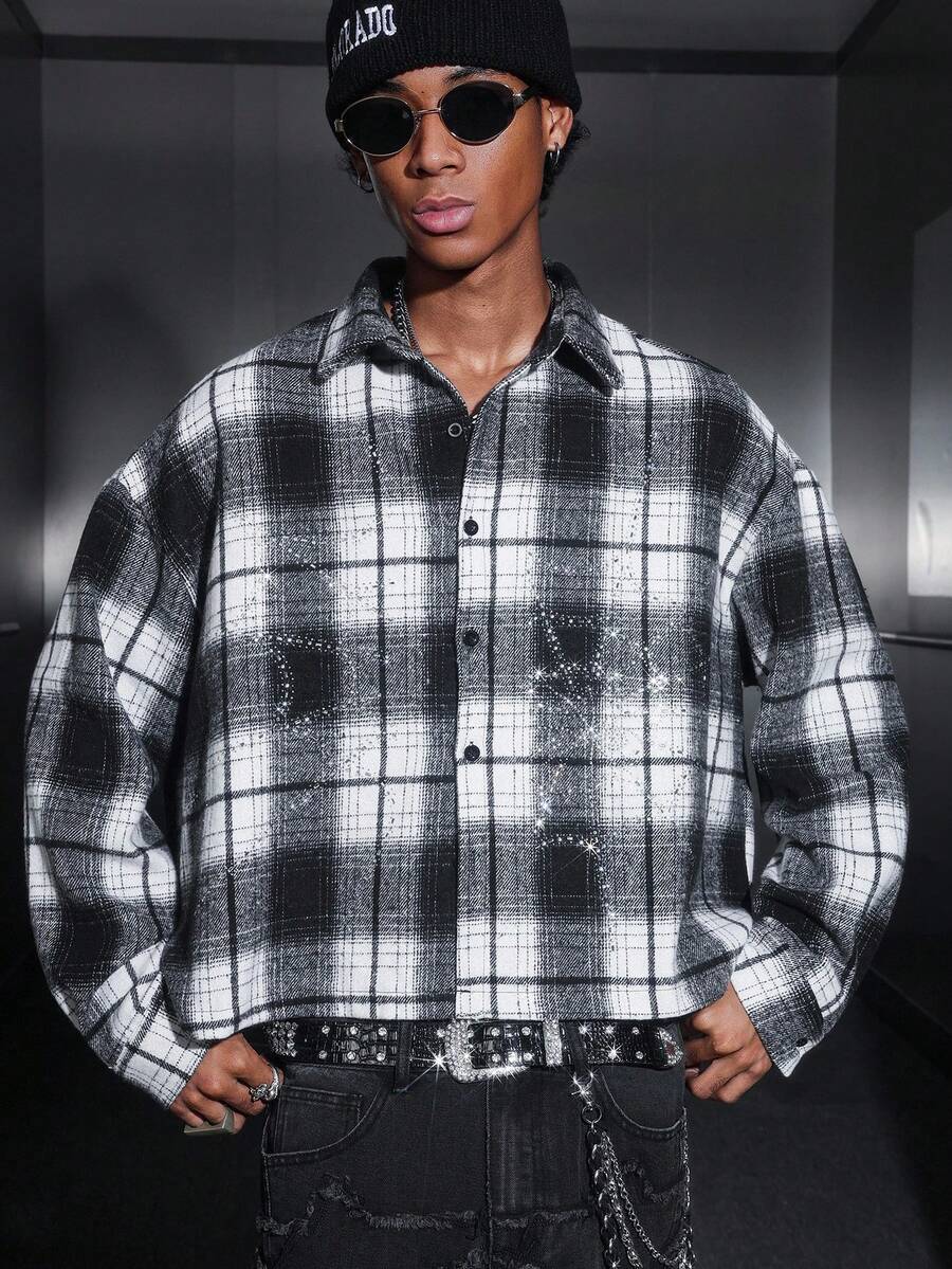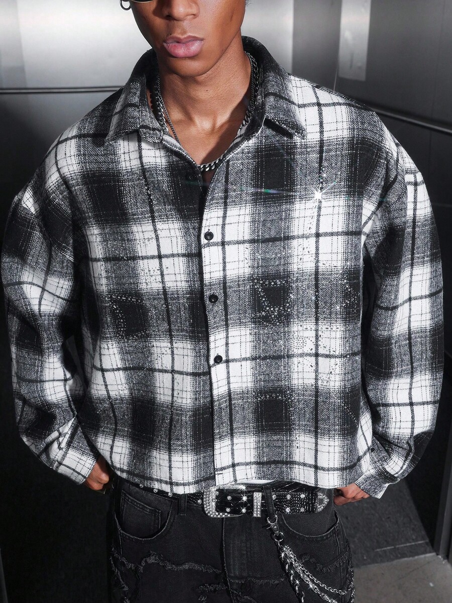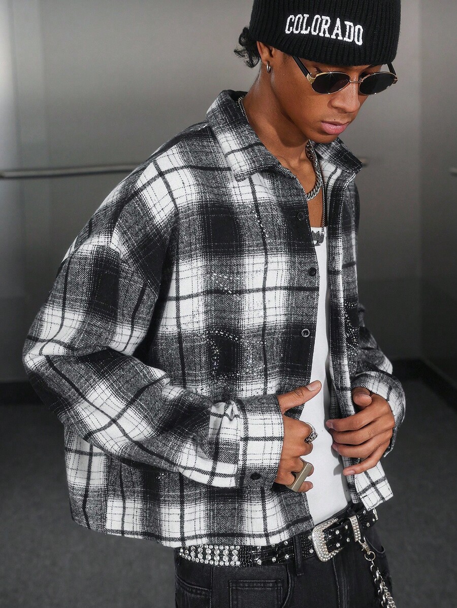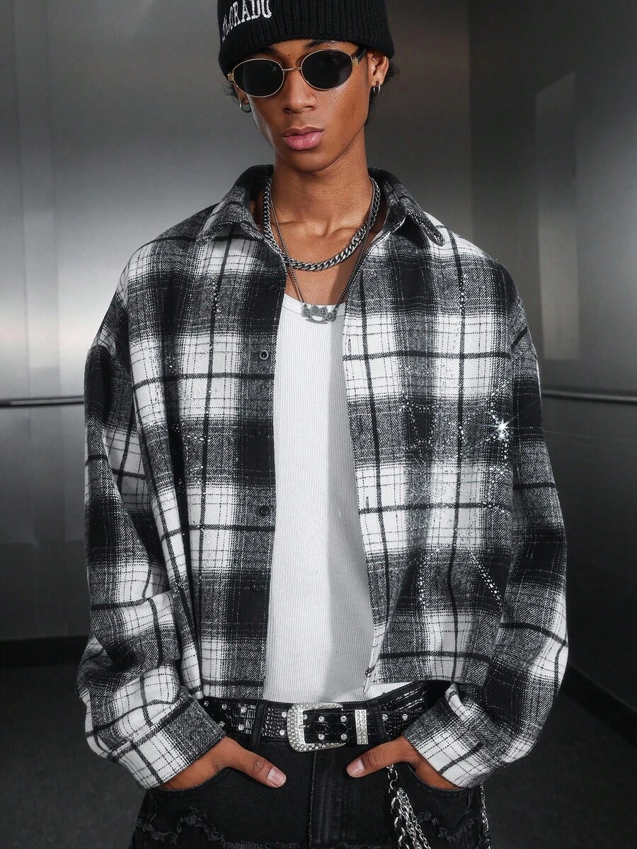 Street Life Men's Plaid Rhinestone Embellished Shacket, For Fall Winter