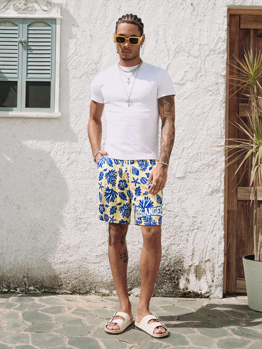 Street Life Men's Plant Print Drawstring Waist Loose Shorts, Suitable For Vacation