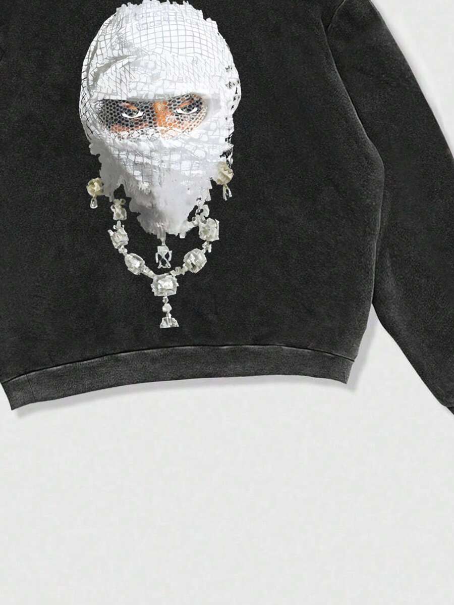 Street Life Men's Printed Balaclava Hooded Sweatshirts Vintage Washed High Street