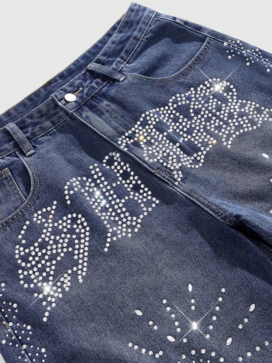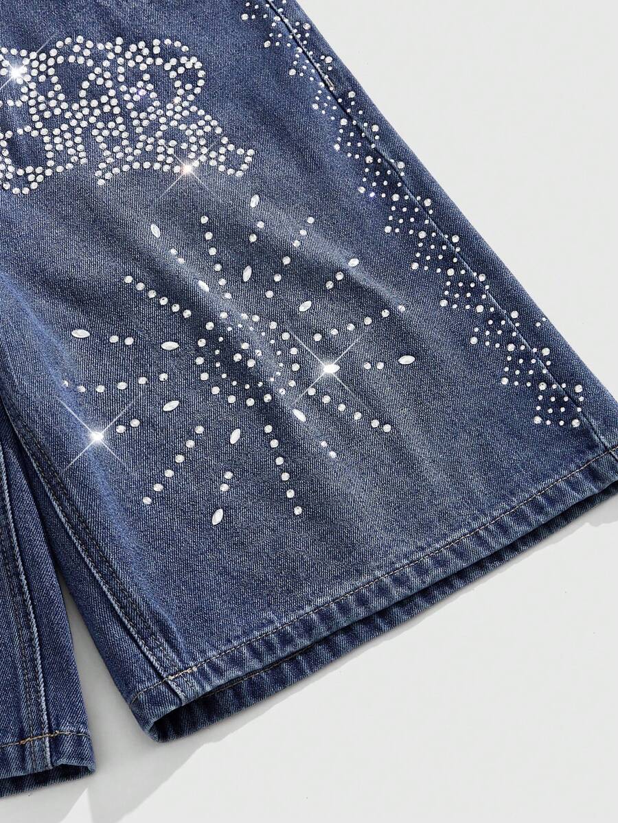 Street Life Men's Summer Casual Rhinestone Letter & Sun Graphic Wash Slant Pocket Denim Shorts