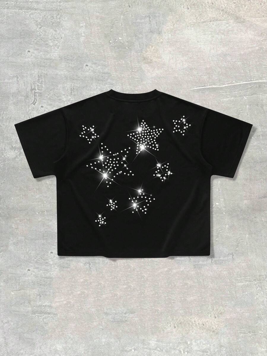 Street Life Men's Summer Rhinestone Five-Pointed Star Pattern Round Neck Short Sleeve Casual T-Shirt, 2000s Style