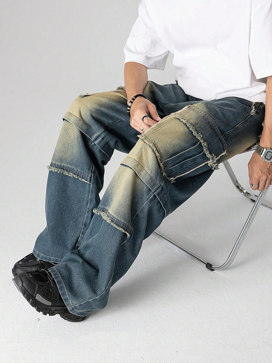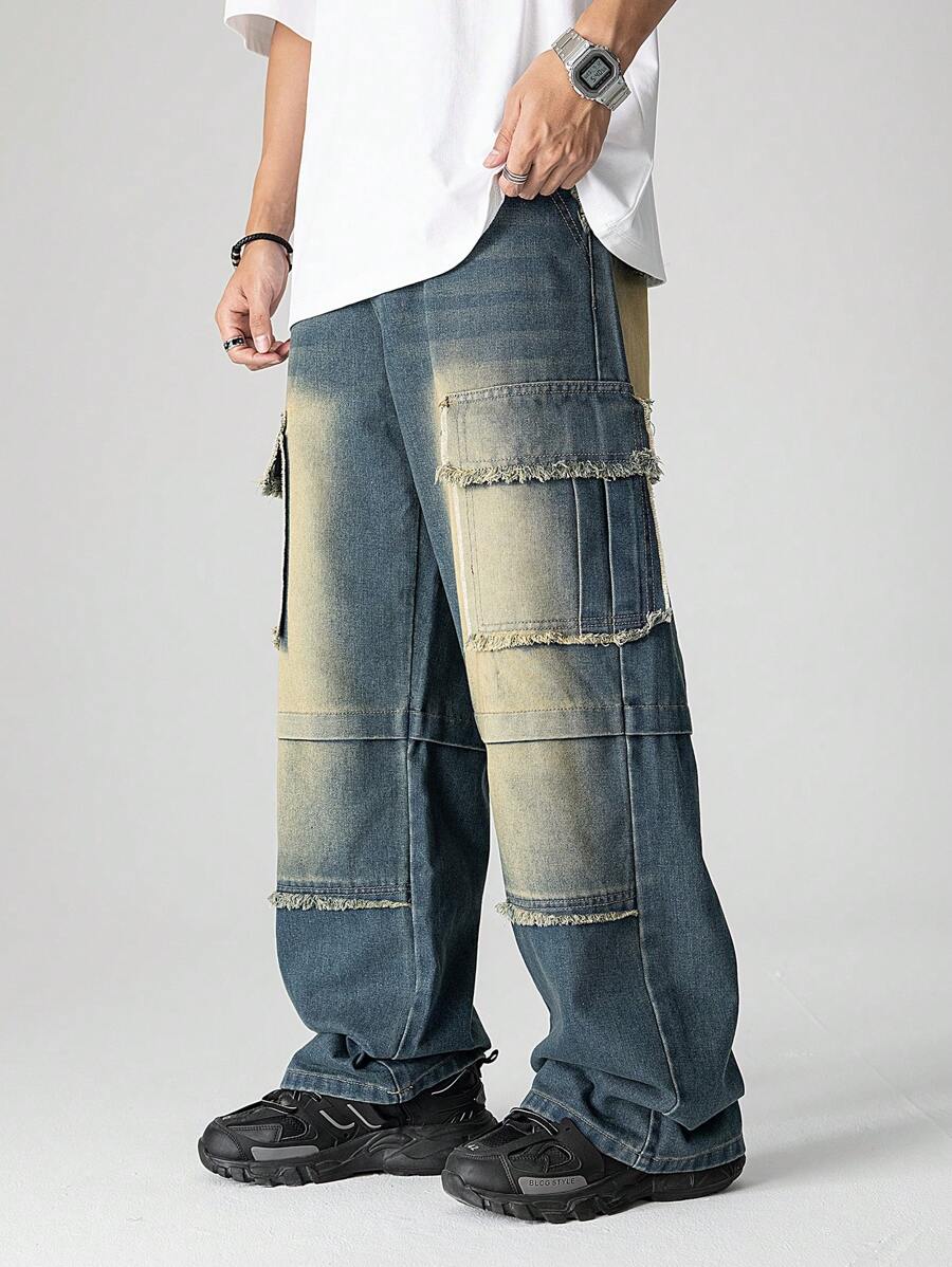 Street Life Men's Vintage Washed Denim Patchwork Jeans, Suitable For Daily Wear In Spring And Summer