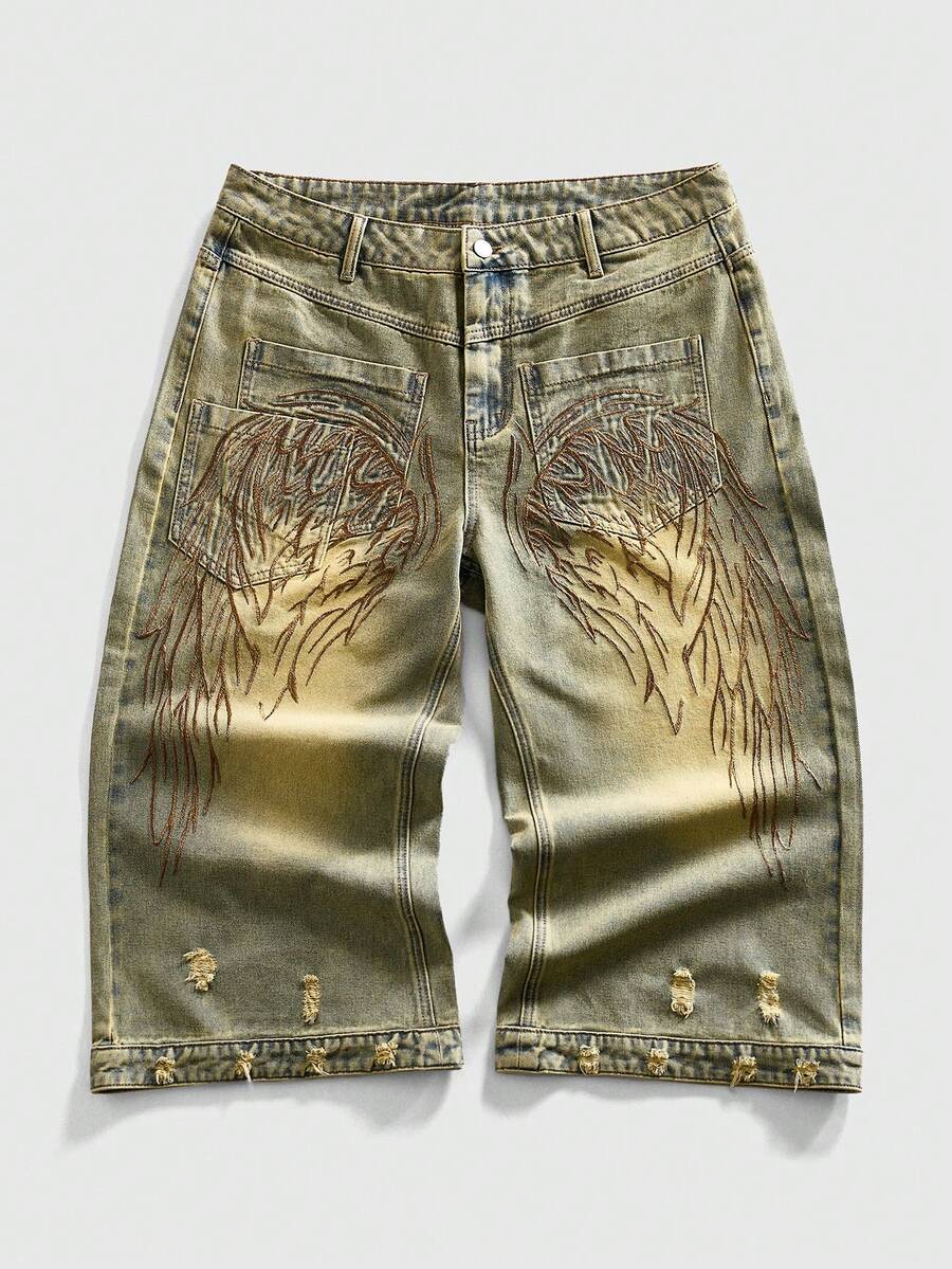 Street Life Men's Wing Embroidery Distressed Loose Fit Denim Shorts