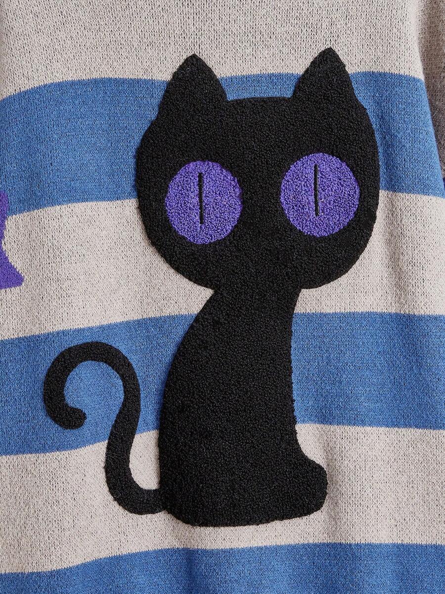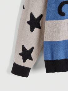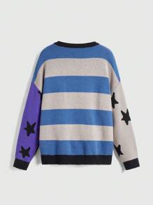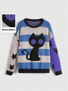 Street Life Retro College Style Vintage Cat Eye Star Pattern Contrast Striped Loose Pullover Sweater For Women