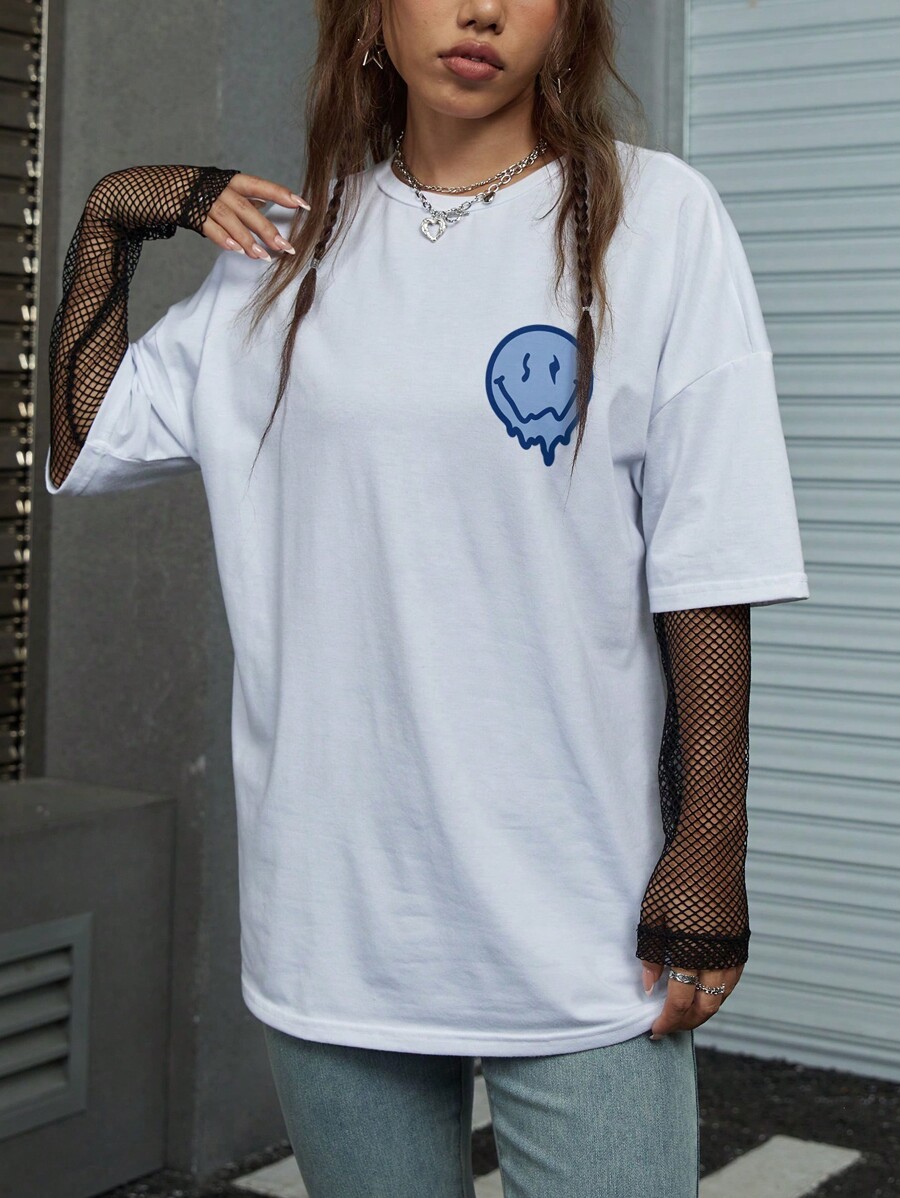 Street Life Slogan Cartoon Face Graphic Oversized Tee With ENJOY THE LITTLE THINGS Print, For School, Unisex