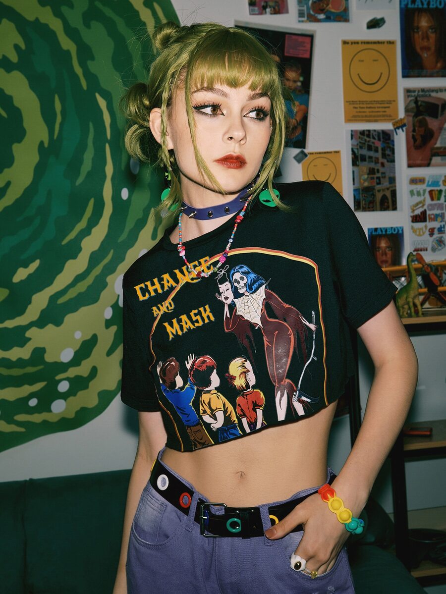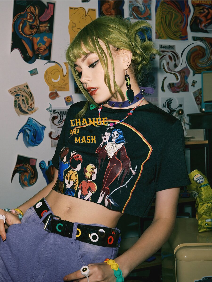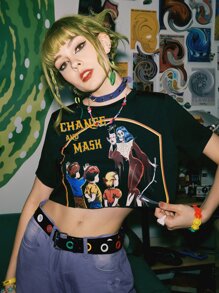 Street Life Slogan Skull & Figure Graphic Crop Tee