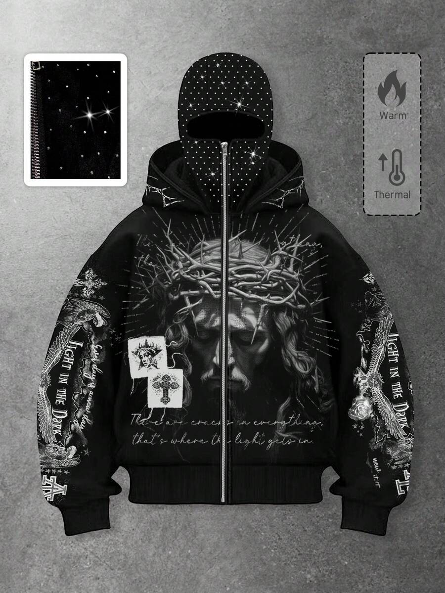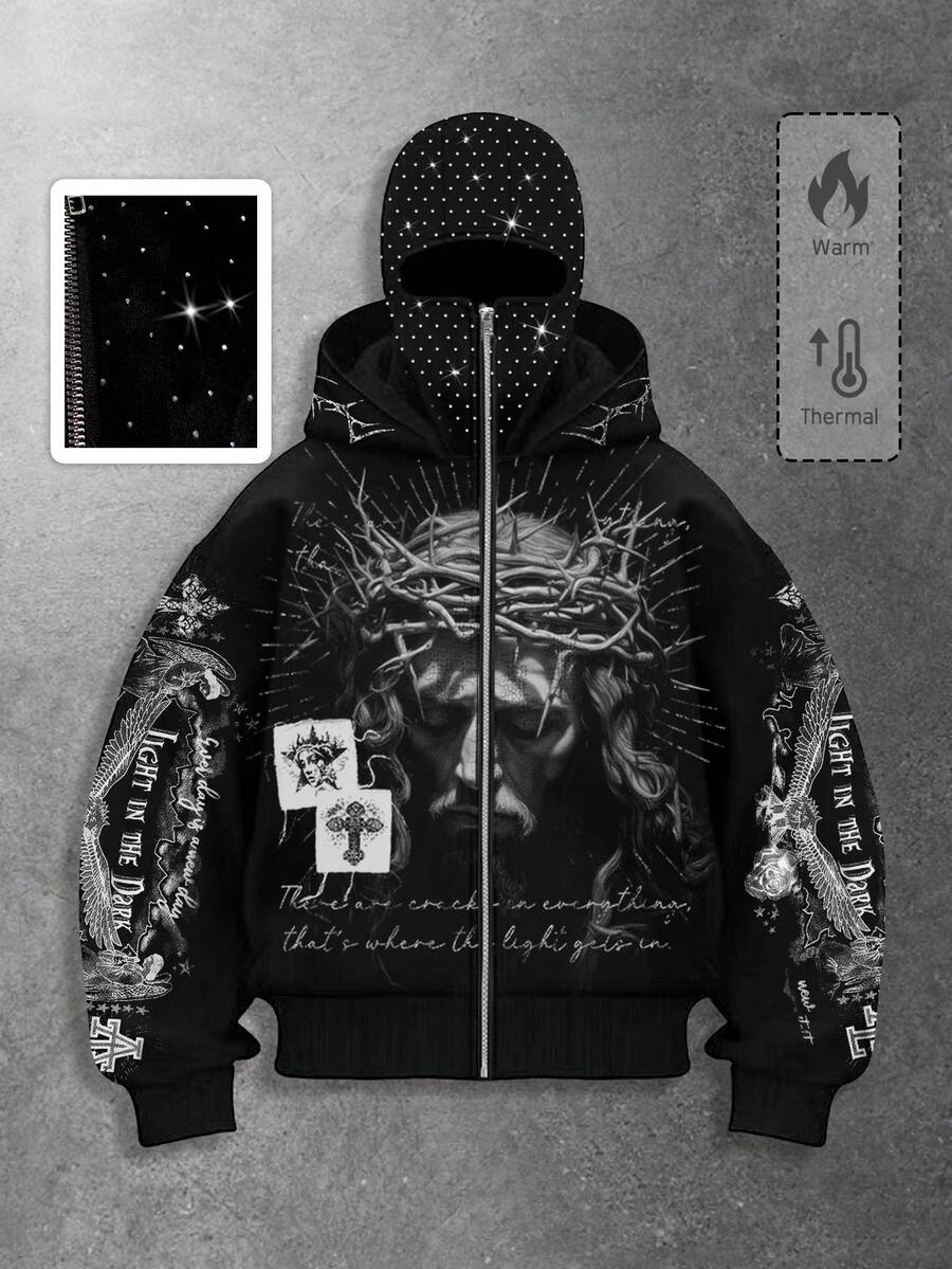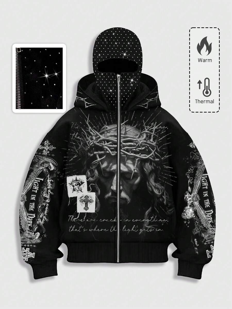 Street Life Stylish Dark Hooded Zip-Up Jesus Sweatshirt Jacket With Rhinestone Embellishment For Men