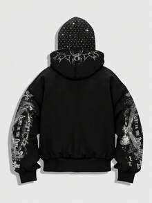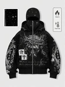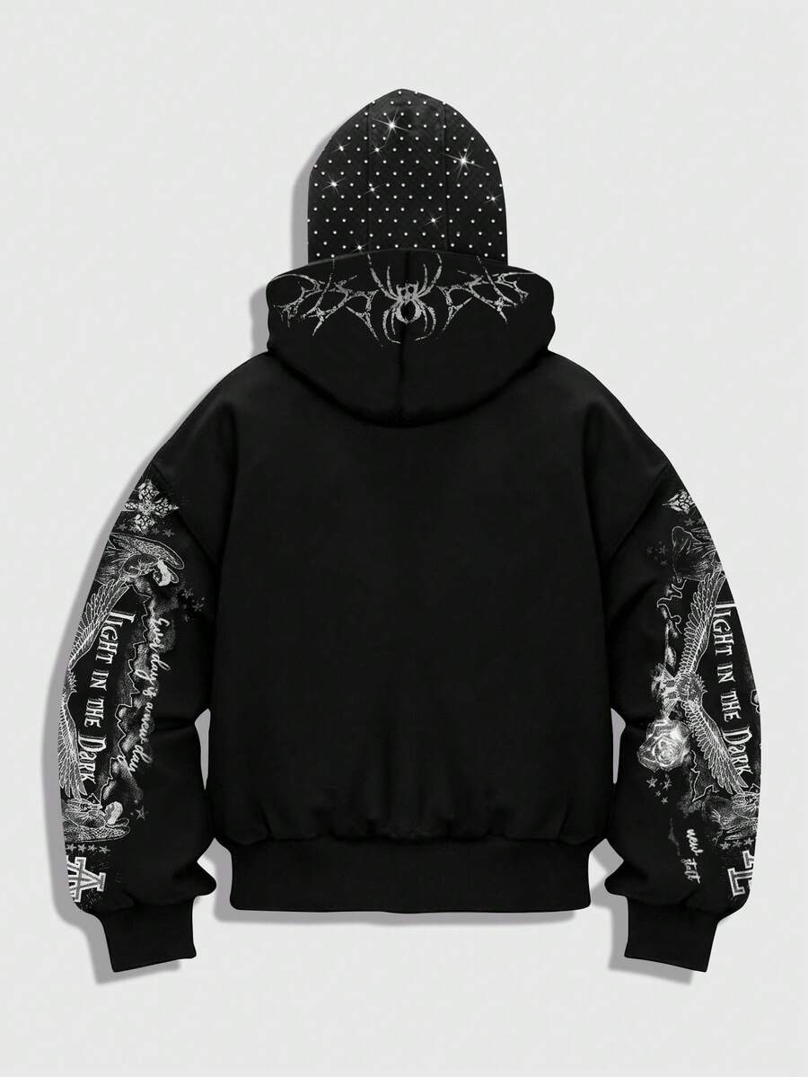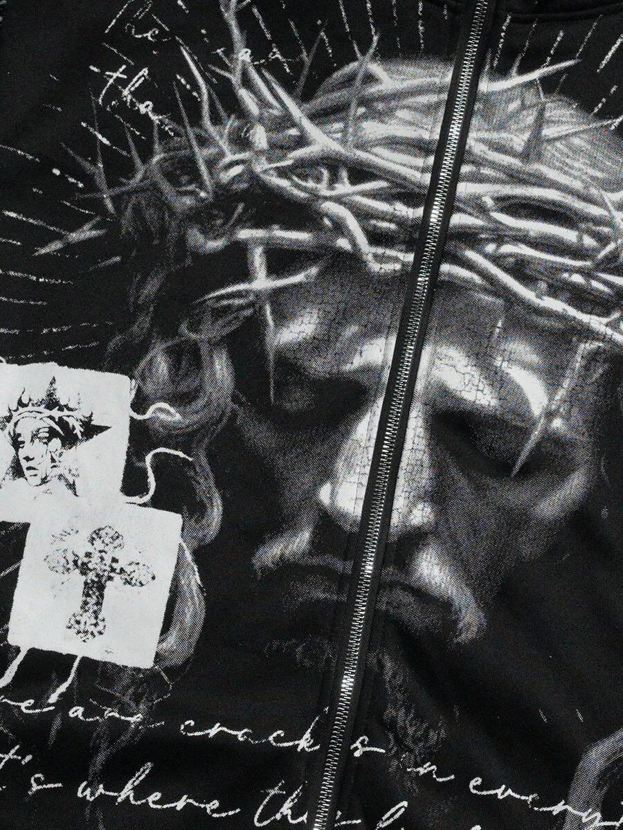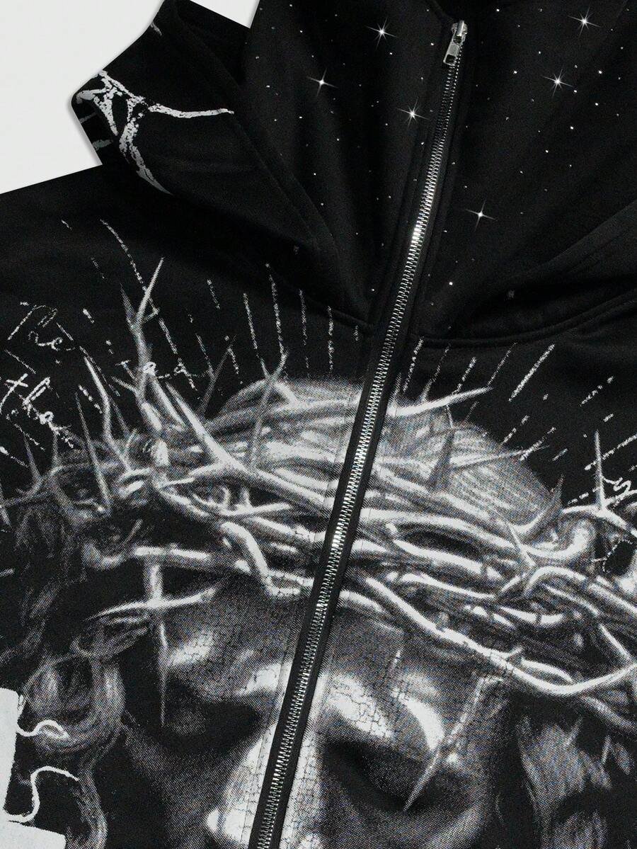 Street Life Stylish Dark Hooded Zip-Up Jesus Sweatshirt Jacket With Rhinestone Embellishment For Men