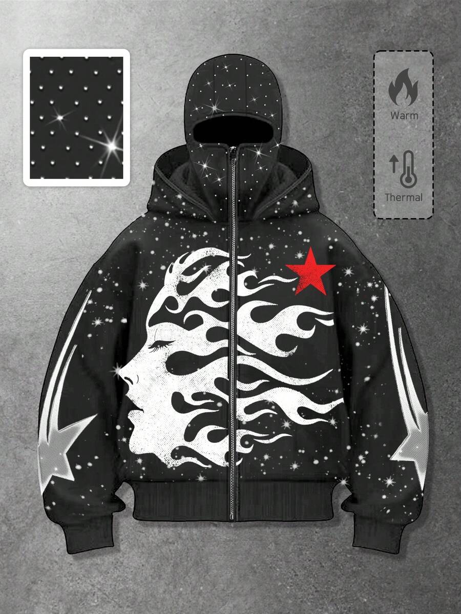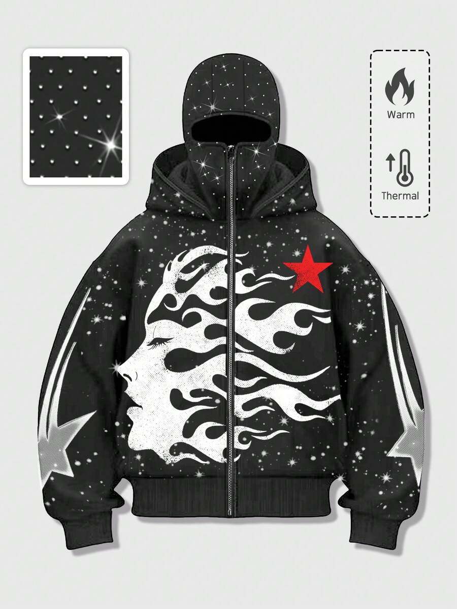 Street Life Stylish Dark Hooded Zip-Up Sweatshirt Jacket With Rhinestone Embellishment For Men