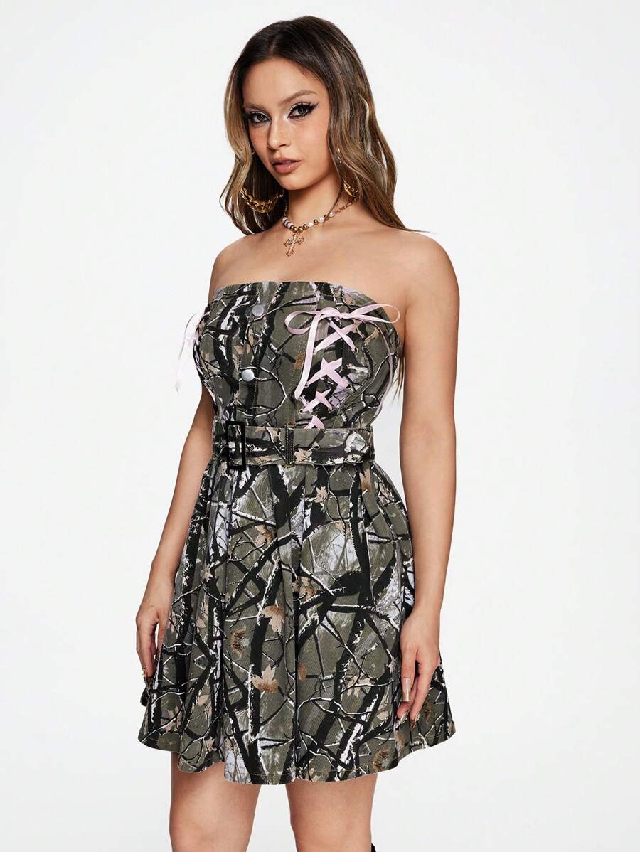 Street Life Y2K Streetwear Satin Bow Camouflage Print Denim Dress For Women